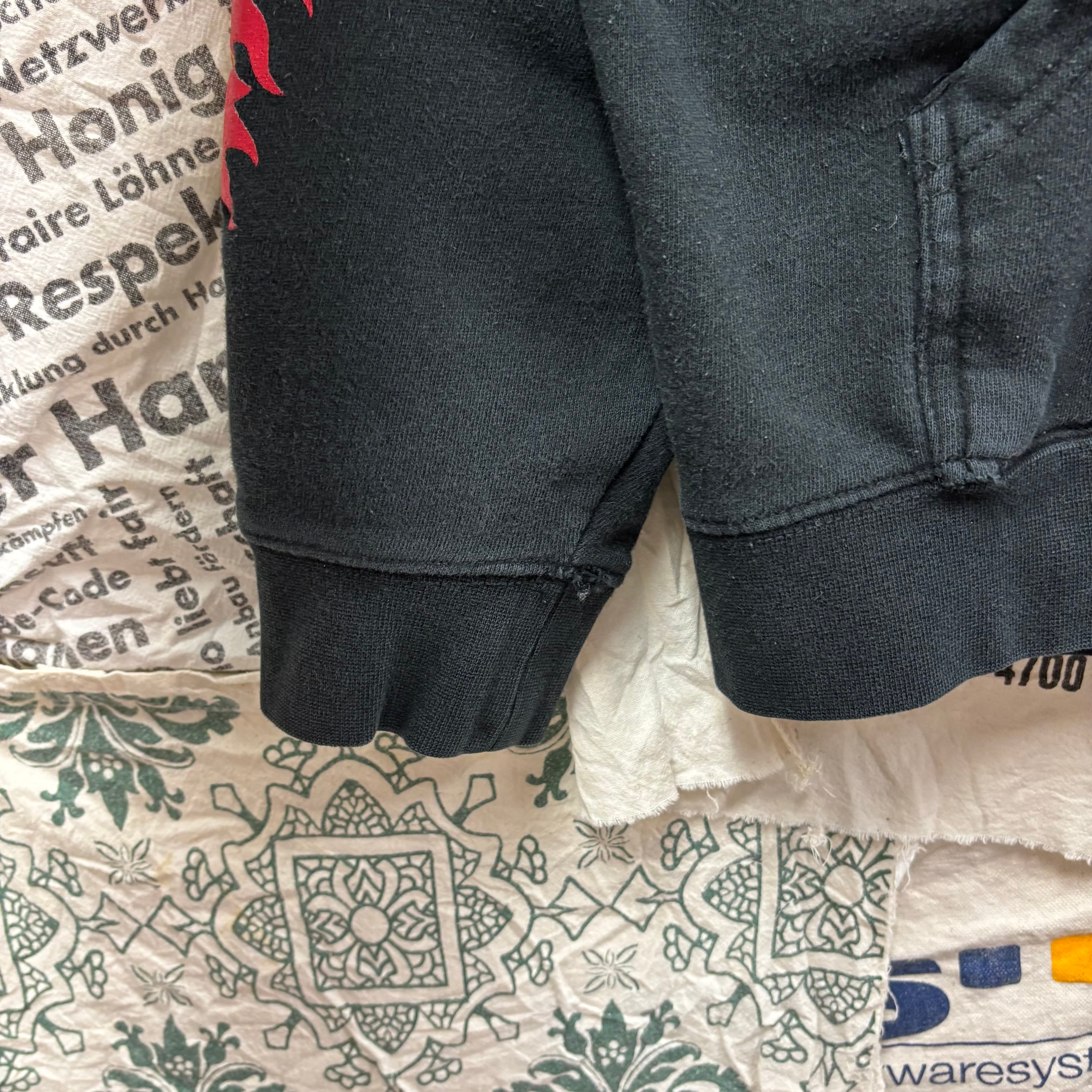 バックには巨大なフレイムハンド、胸元にはサークルロゴ、さらに右袖にはインパクトのあるフレイムラインが施された贅沢なデザイン。1枚で主役になれるアイテムです。