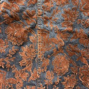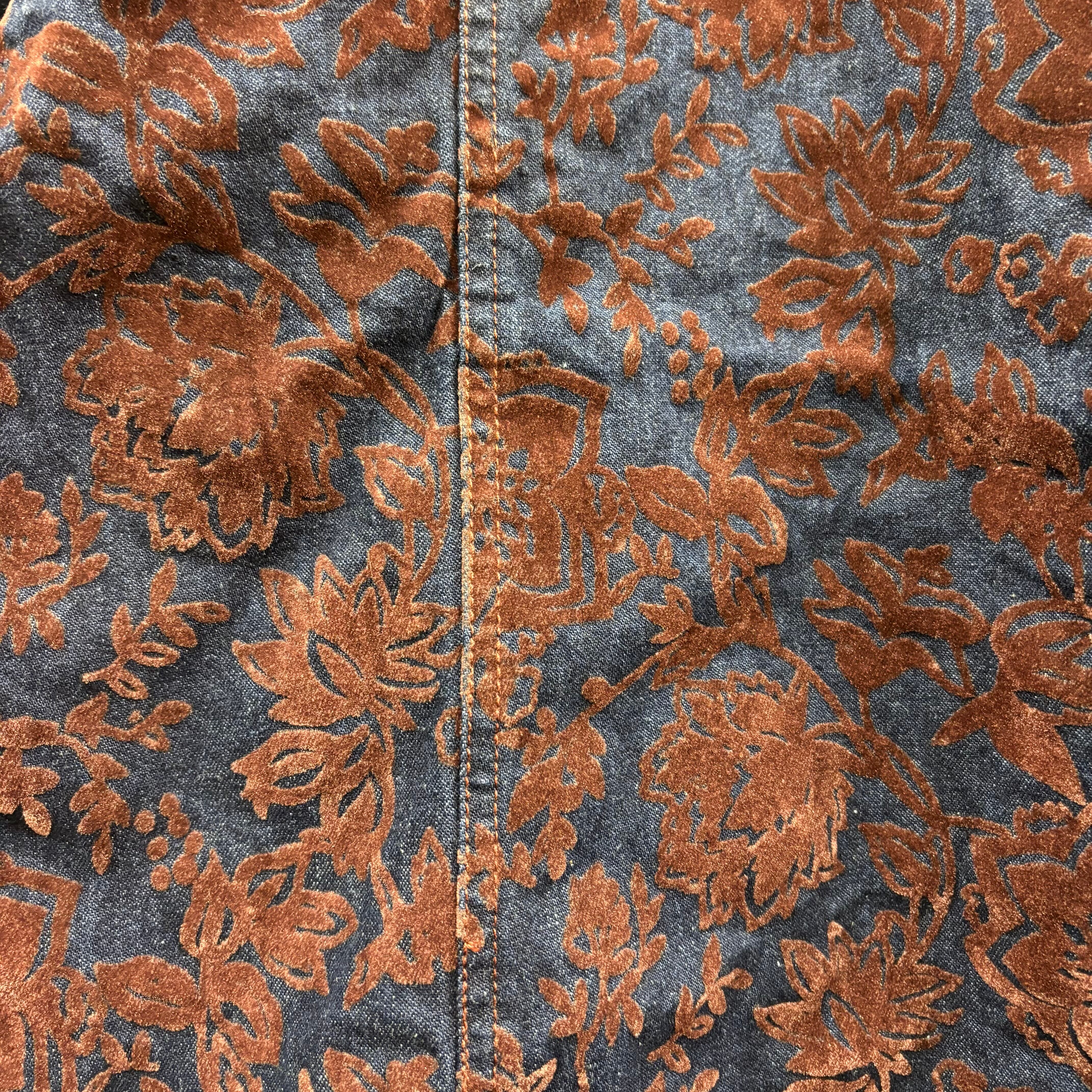デニム地にベロアのような起毛感のあるフロッキー加工で花柄が表現されており、光の当たり方で表情が変わる非常に手の込んだ作りです。