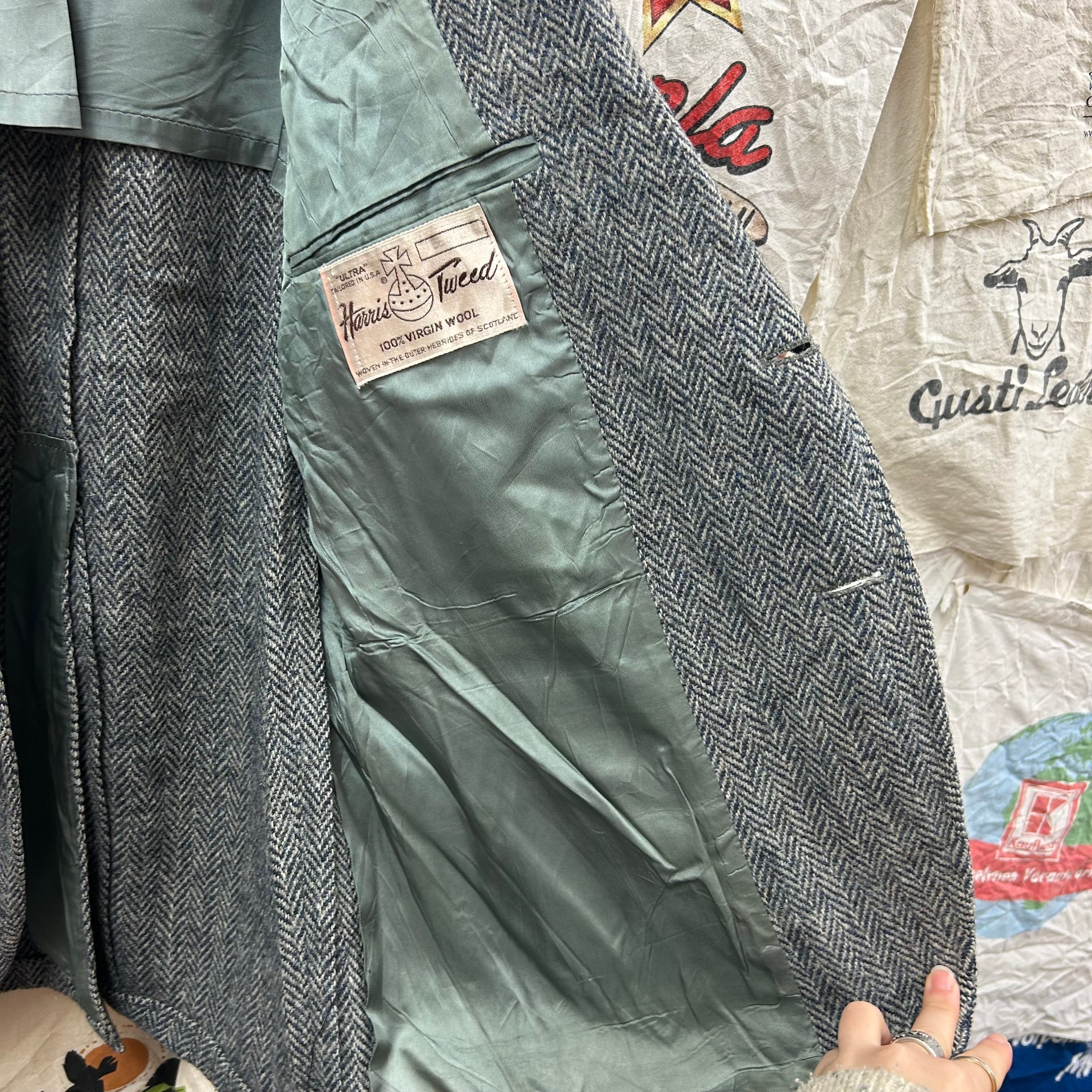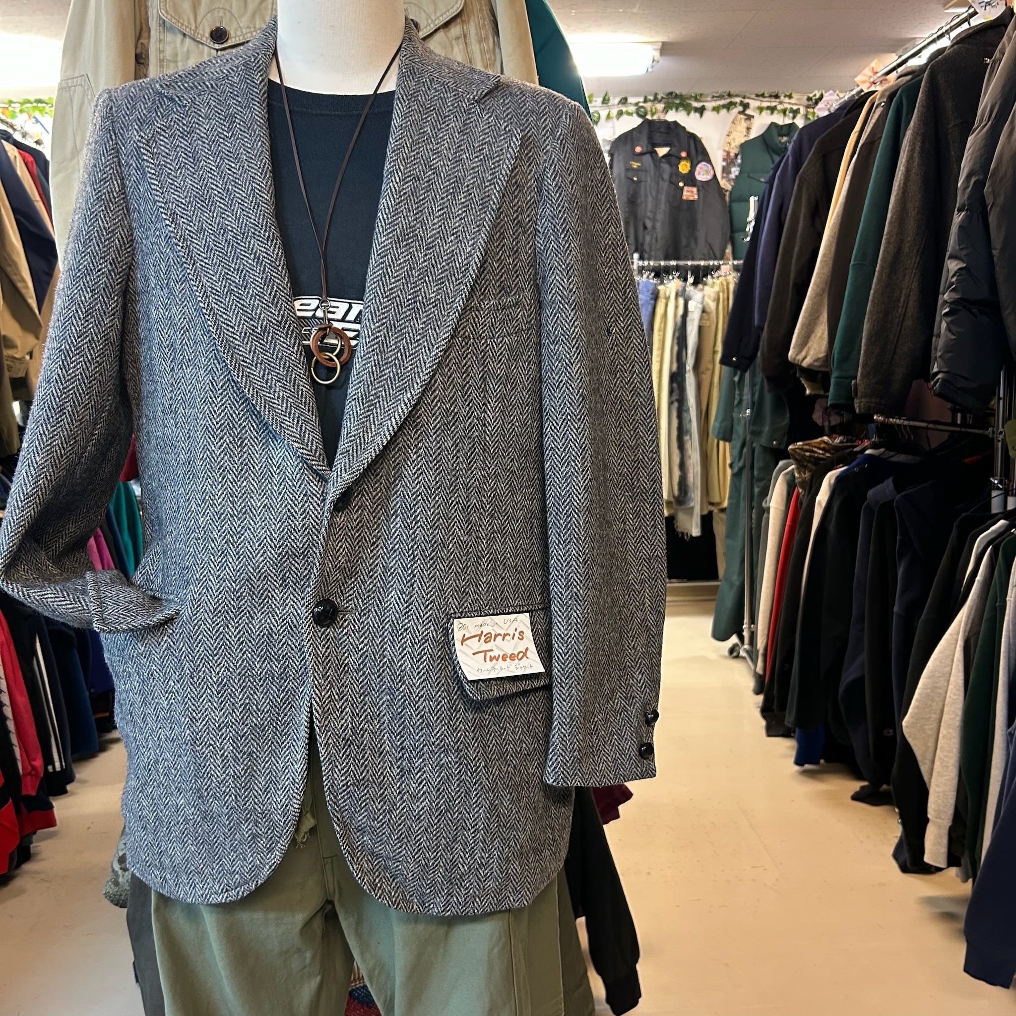 80年代 USA製 Harris Tweed のツイードジャケット。ウールならではのザックリ素材感とヘリンボーン調の雰囲気が古着コーデにバッチリ。