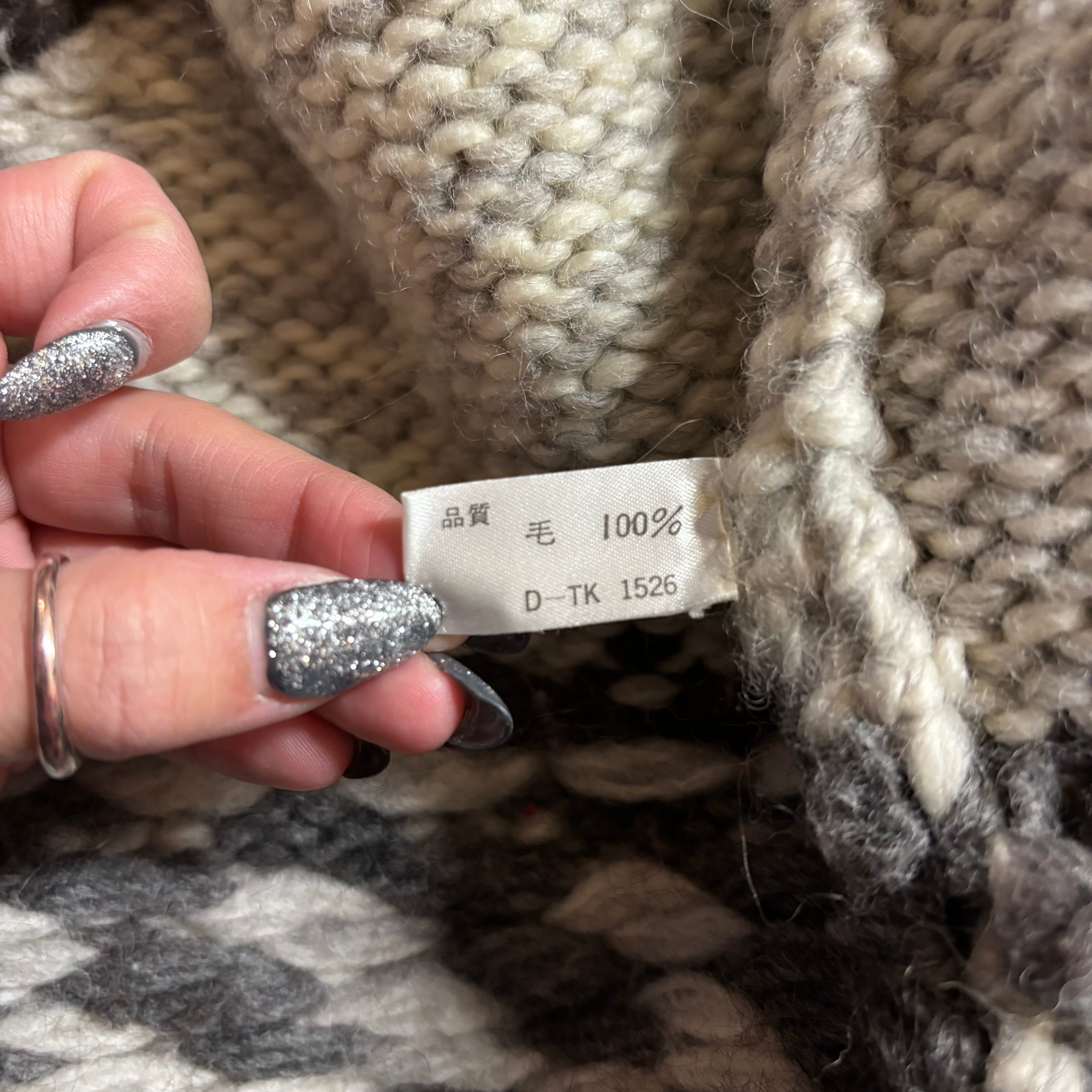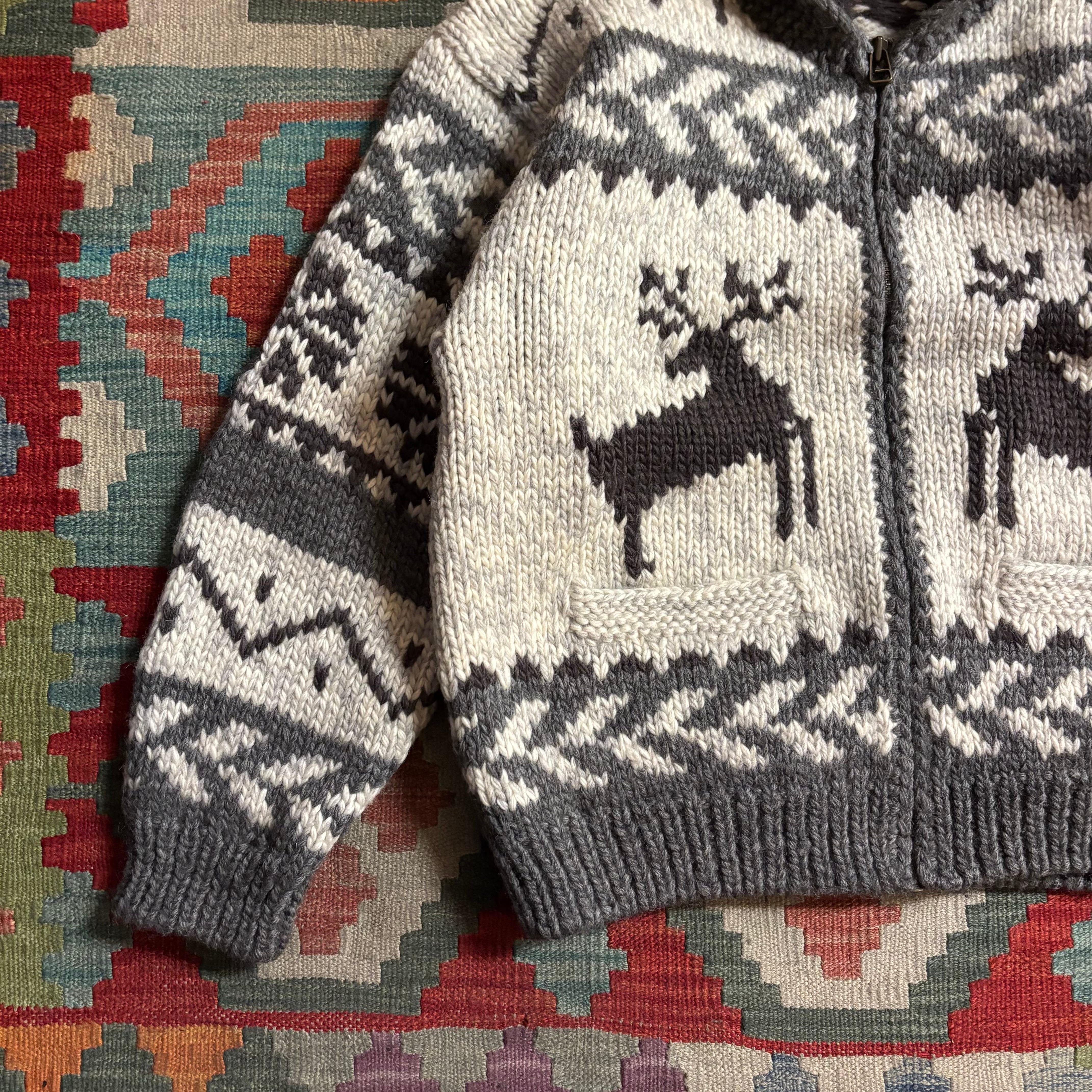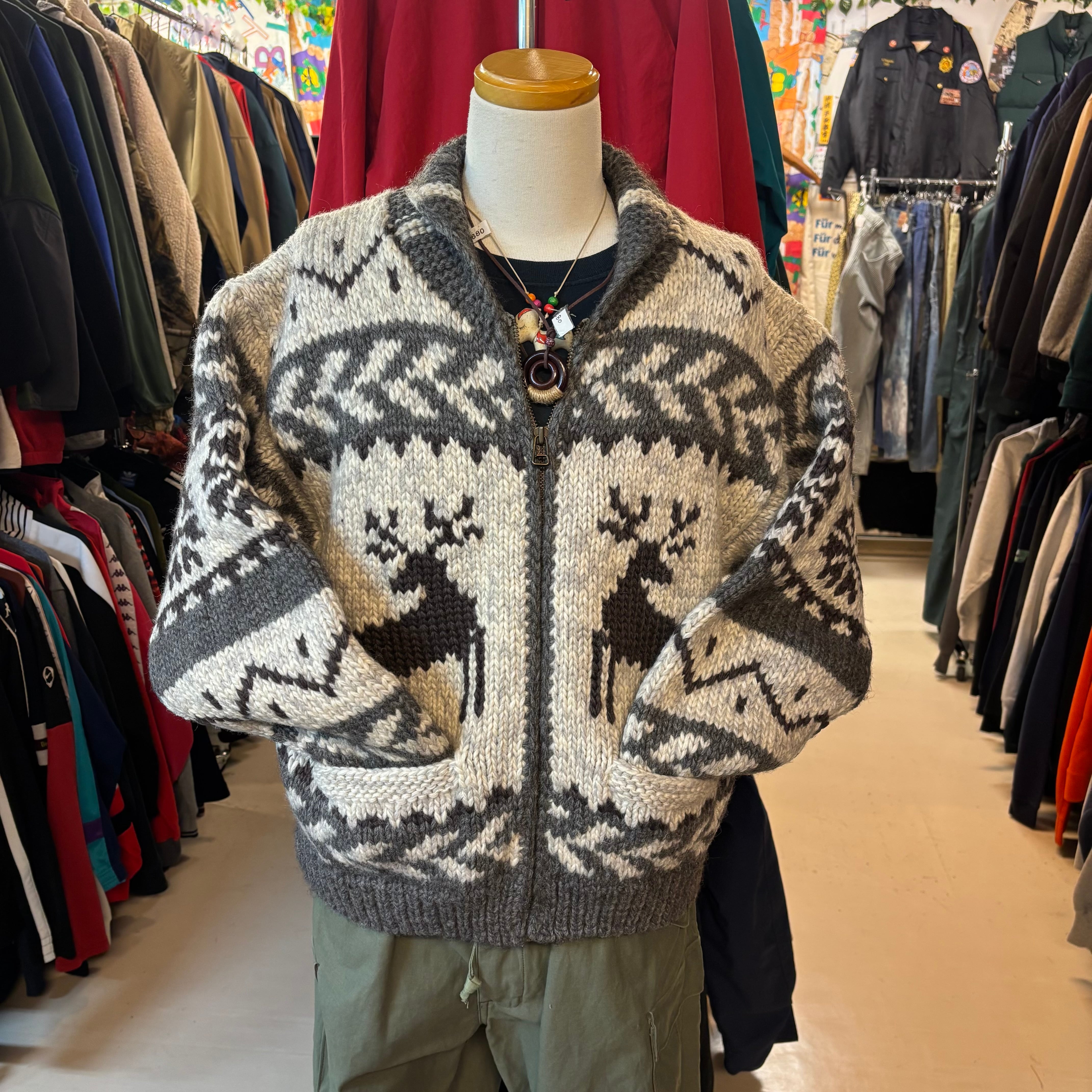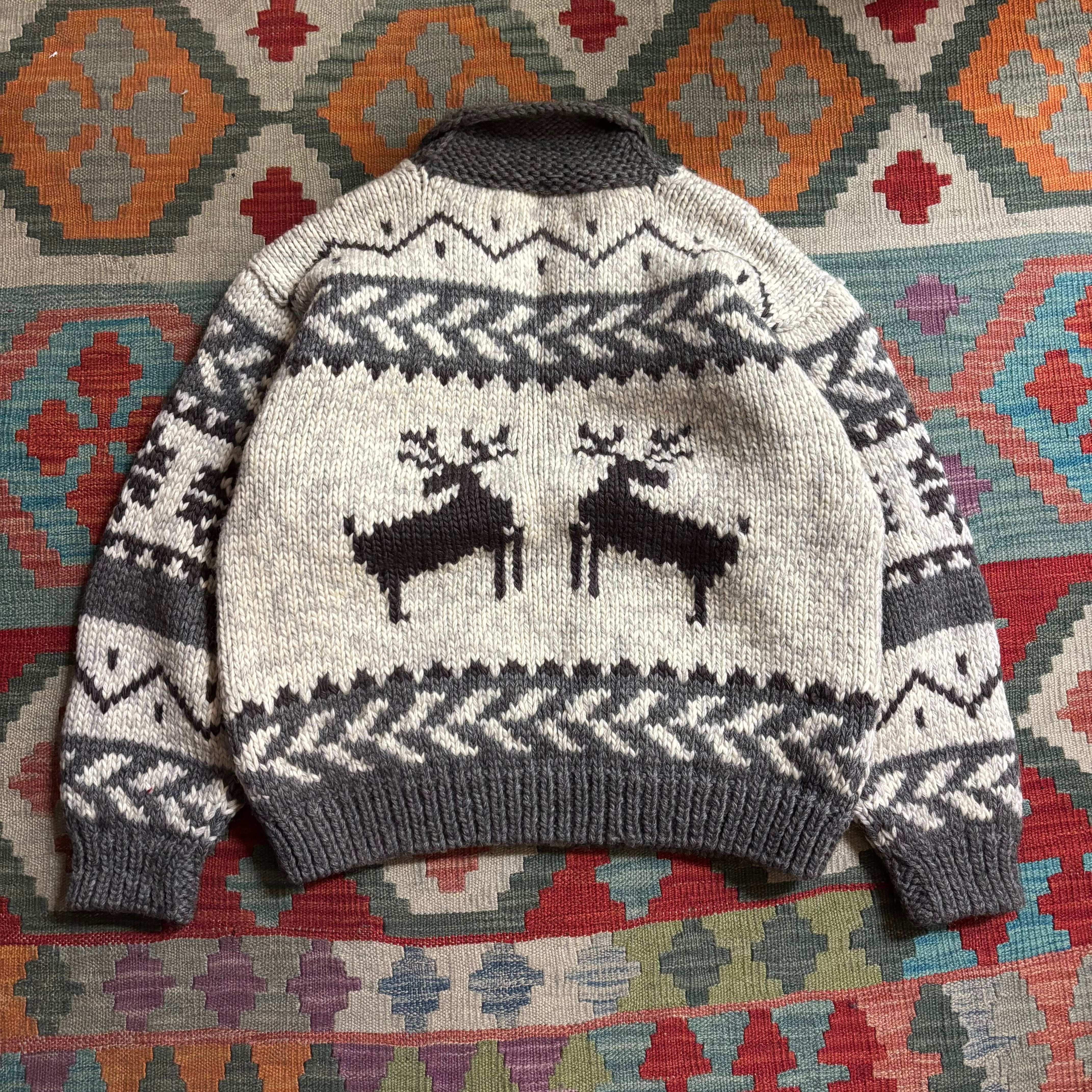 これぞカウチンと言える圧倒的なボリューム感と、手編みのような温もりのある質感が特徴。グレー×ホワイトのモノトーンを基調とした配色に、胸元のトナカイ柄が映える、トレンドに左右されないクラシックな一着です。