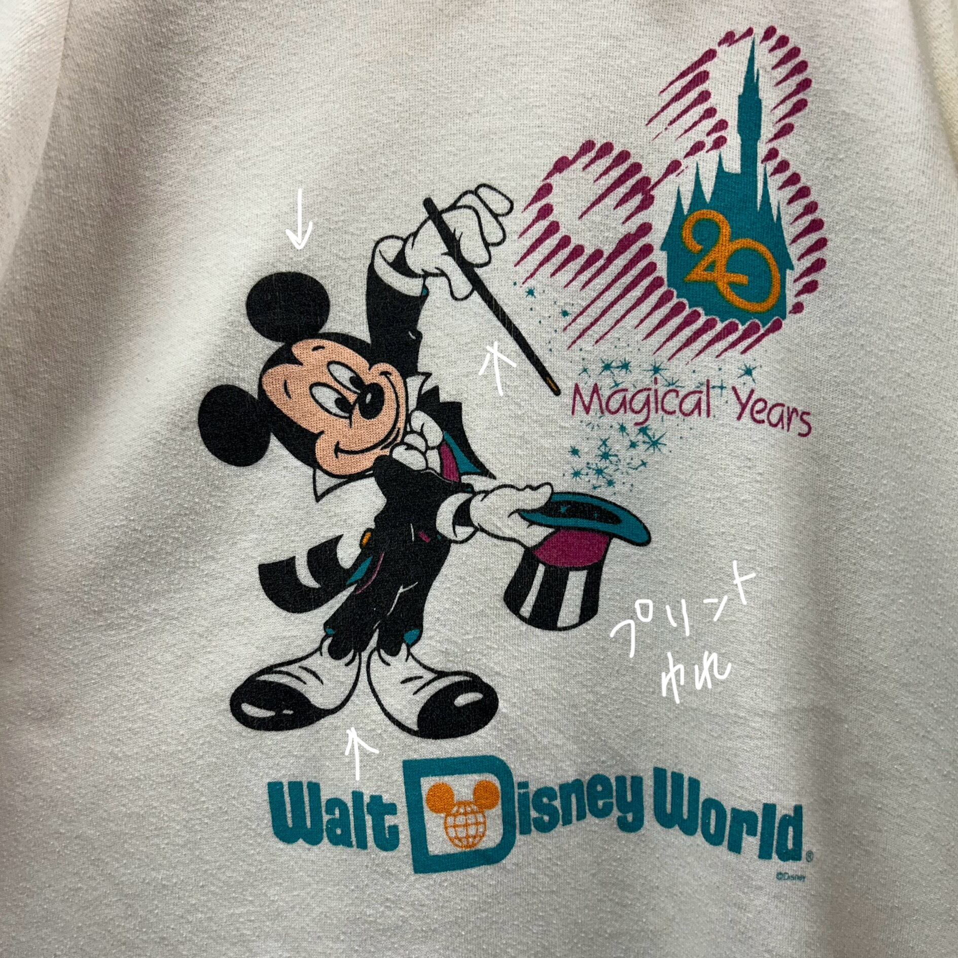 「20 Magical Years」(20周年記念)プリントがどこかレトロで、90年代前後の カレッジ×テーマパーク古着 ムード全開。