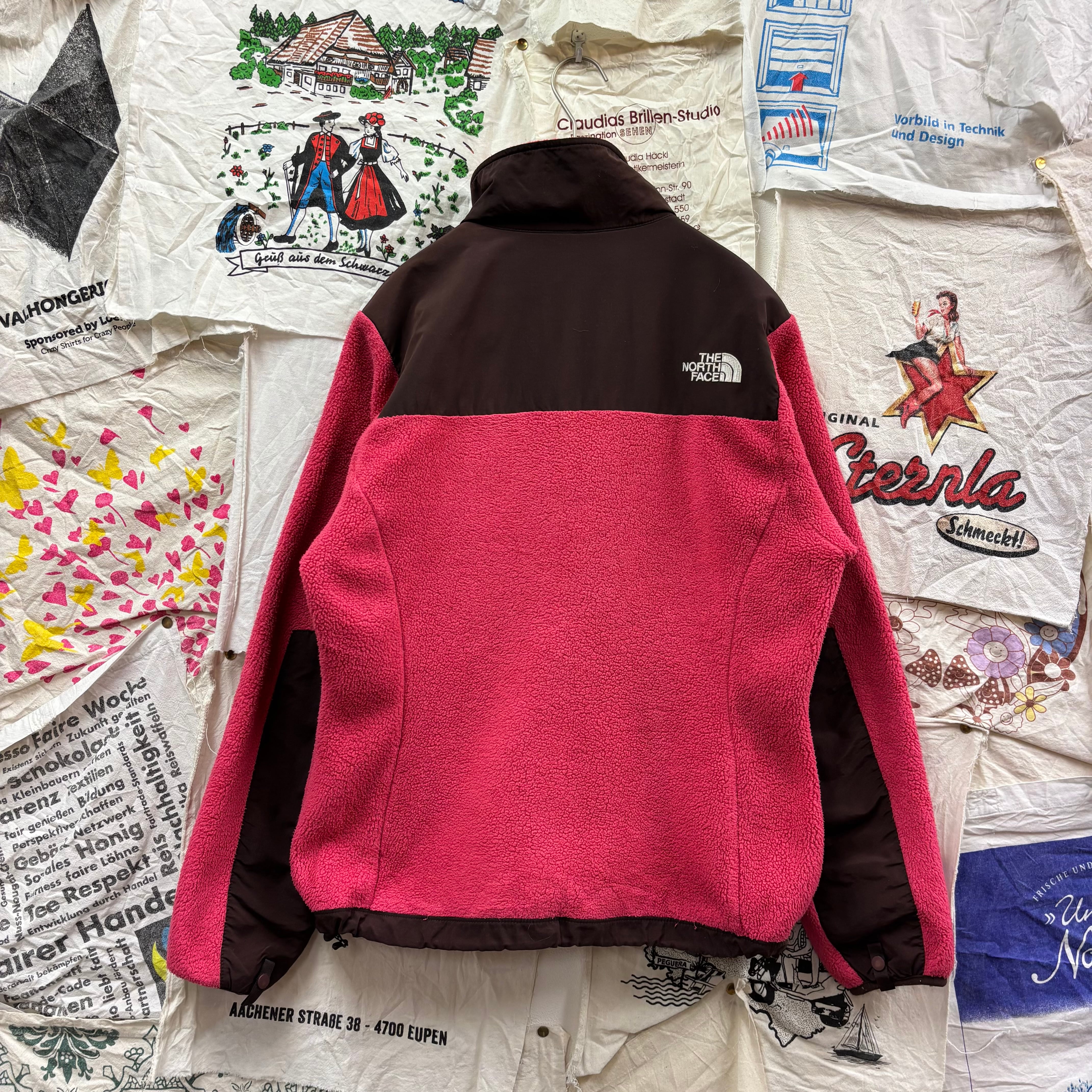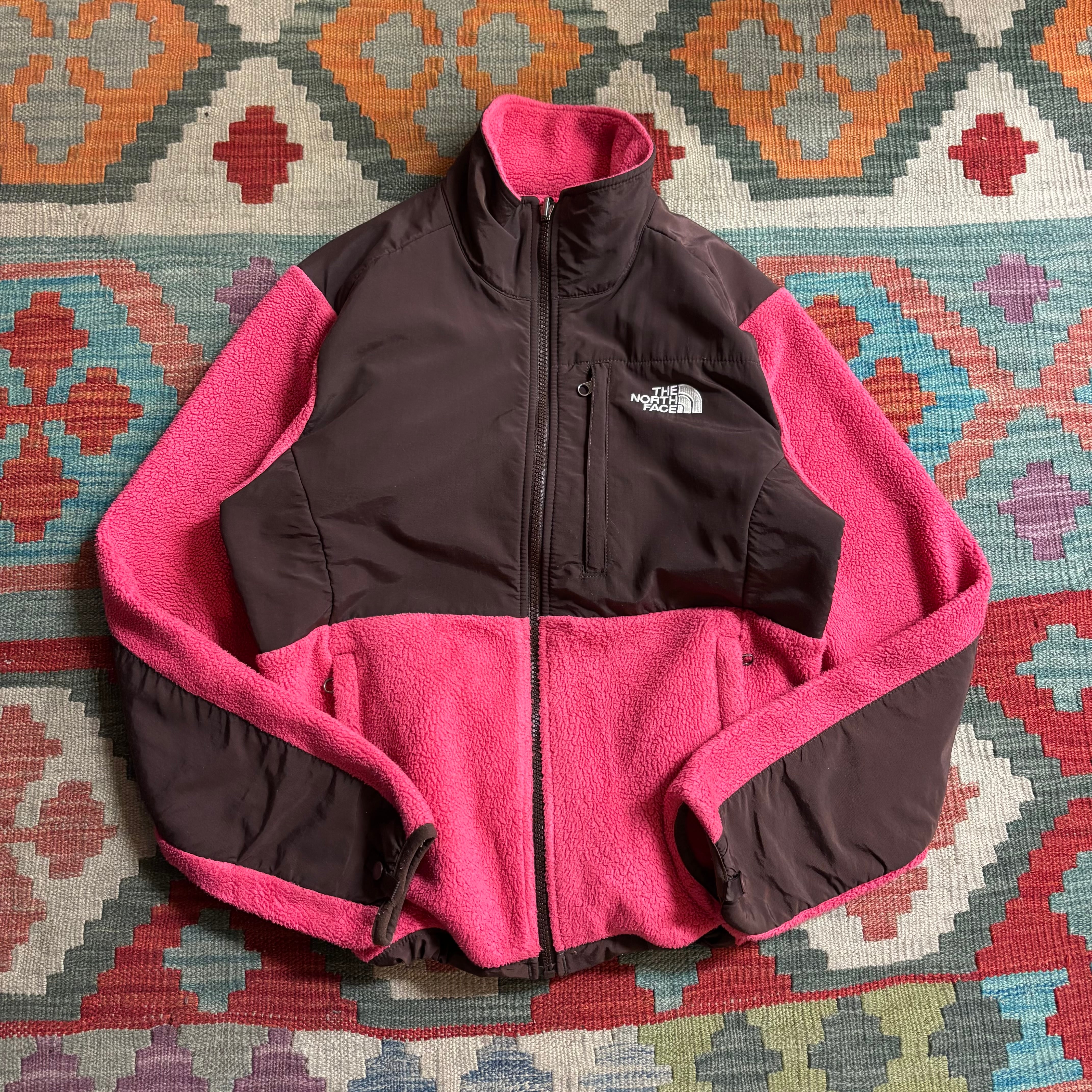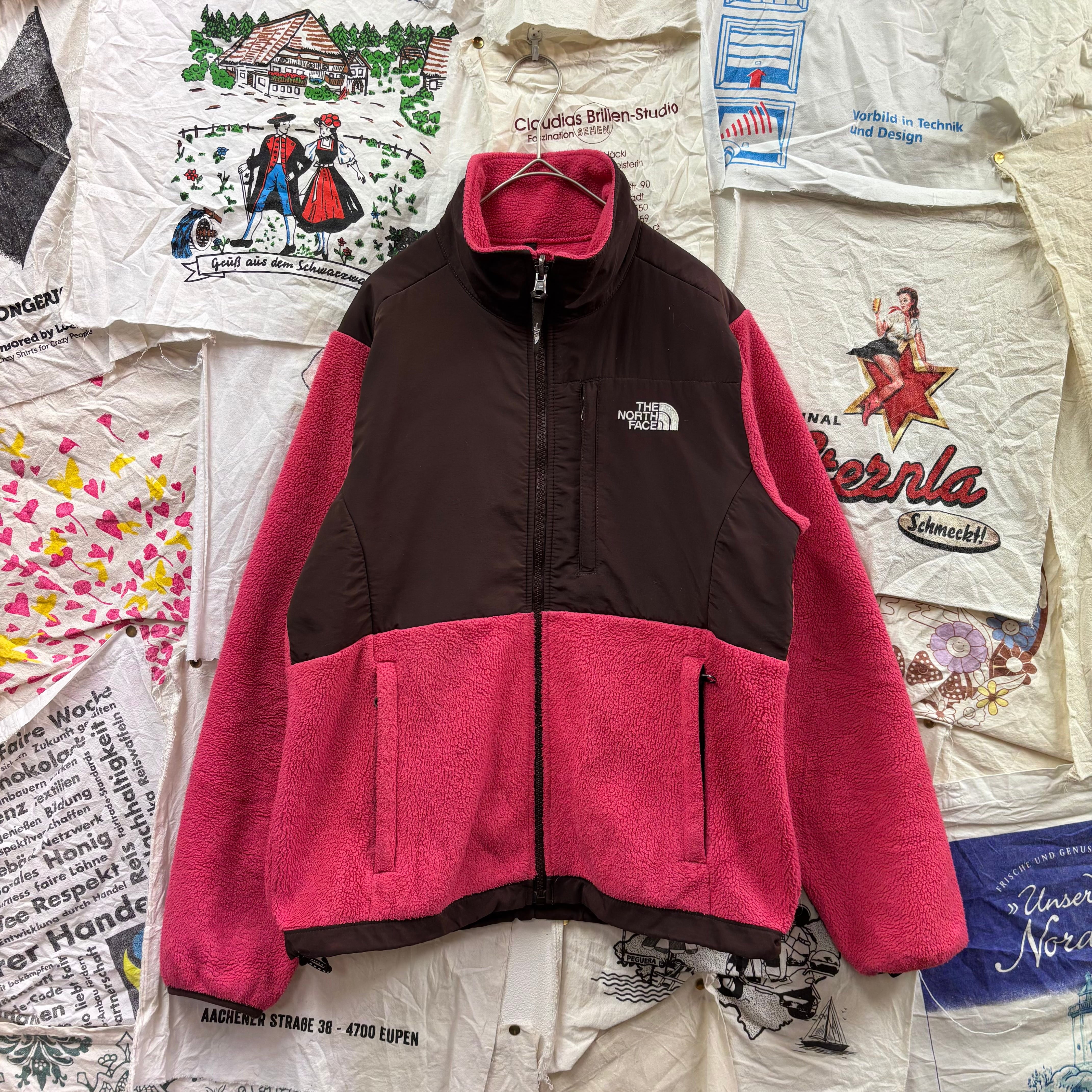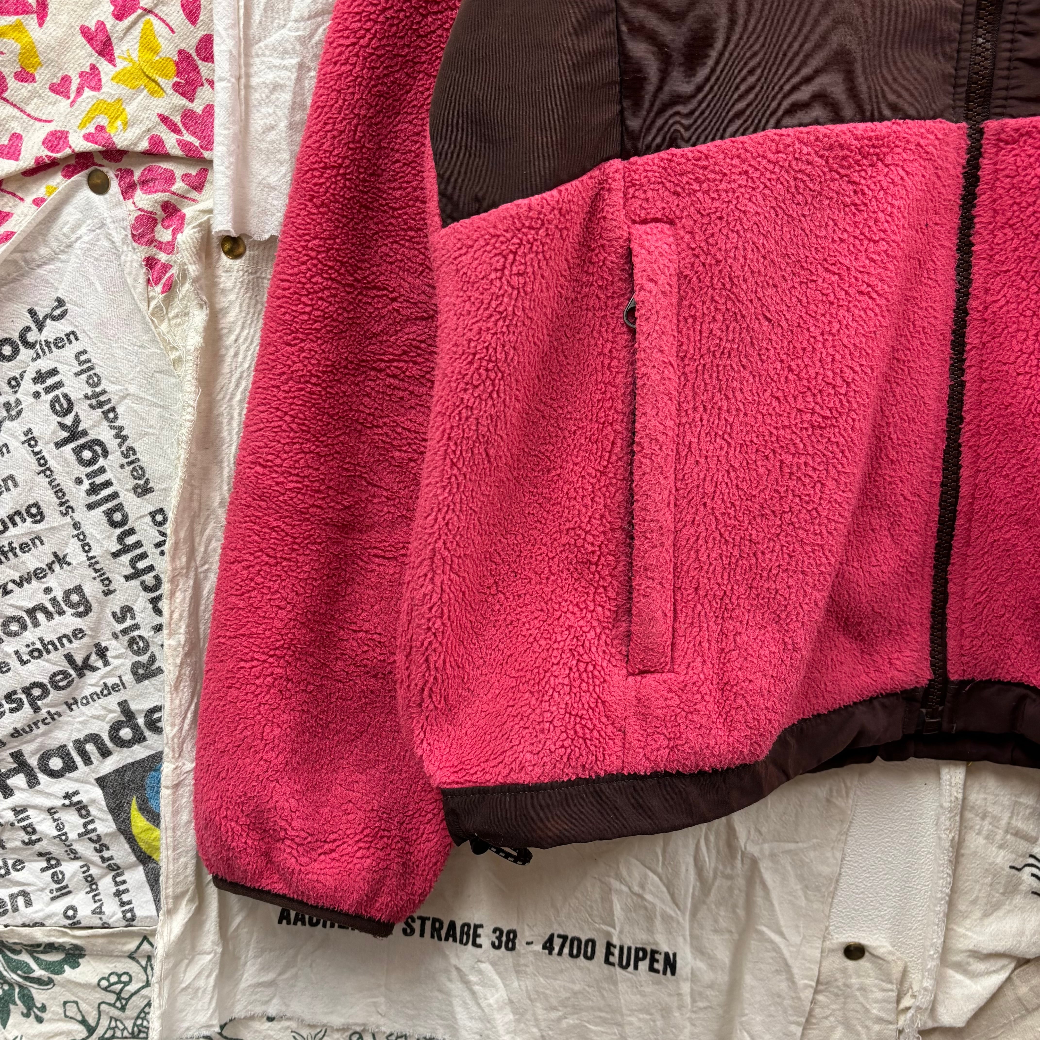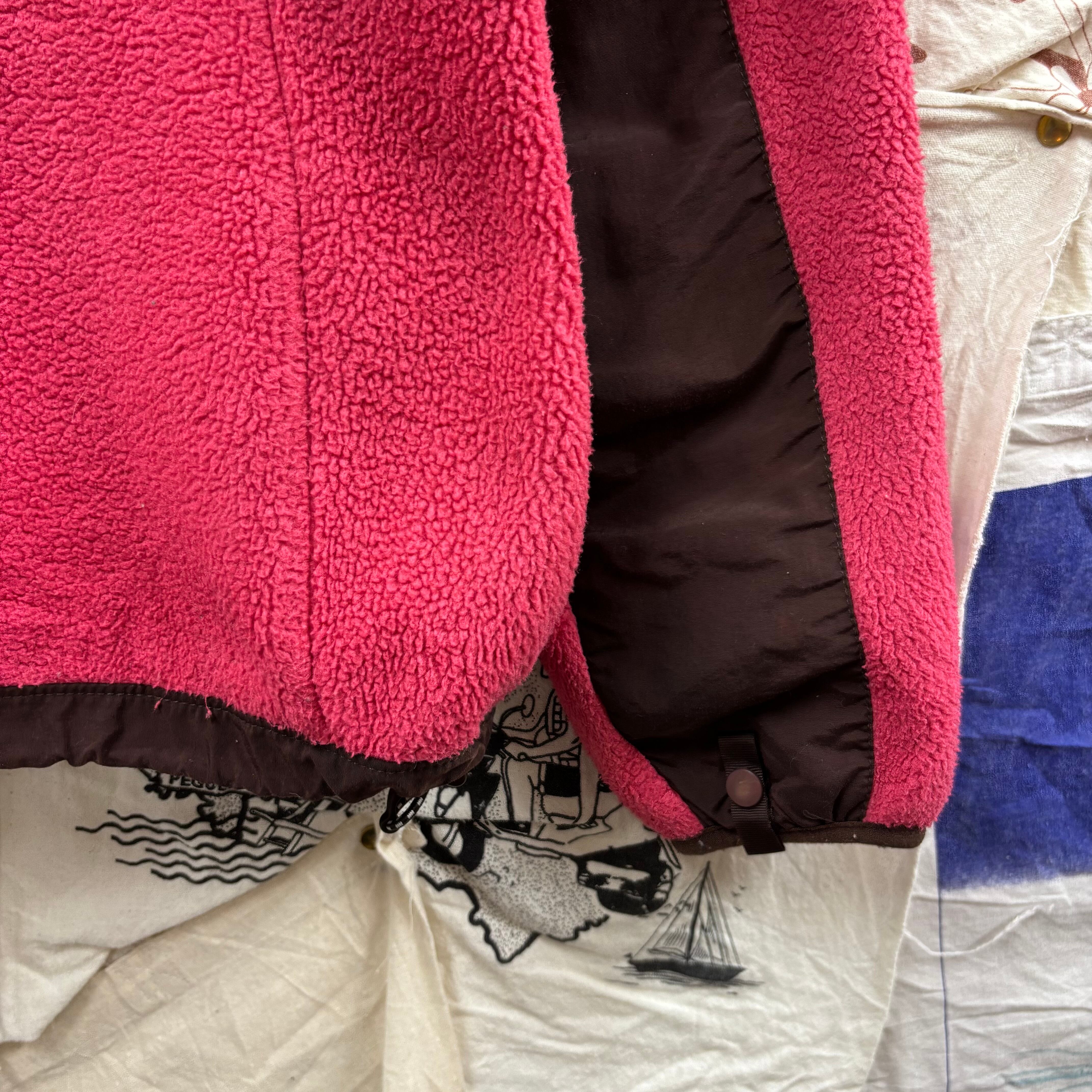 ピンクとブラウンの切り替えが目を引く、非常に珍しく可愛らしいカラーリングの一着。フリース素材で暖かく、肩や胸元のナイロン切り替えにより、バックパックを背負っても生地が傷みにくいタフな仕様になっています。