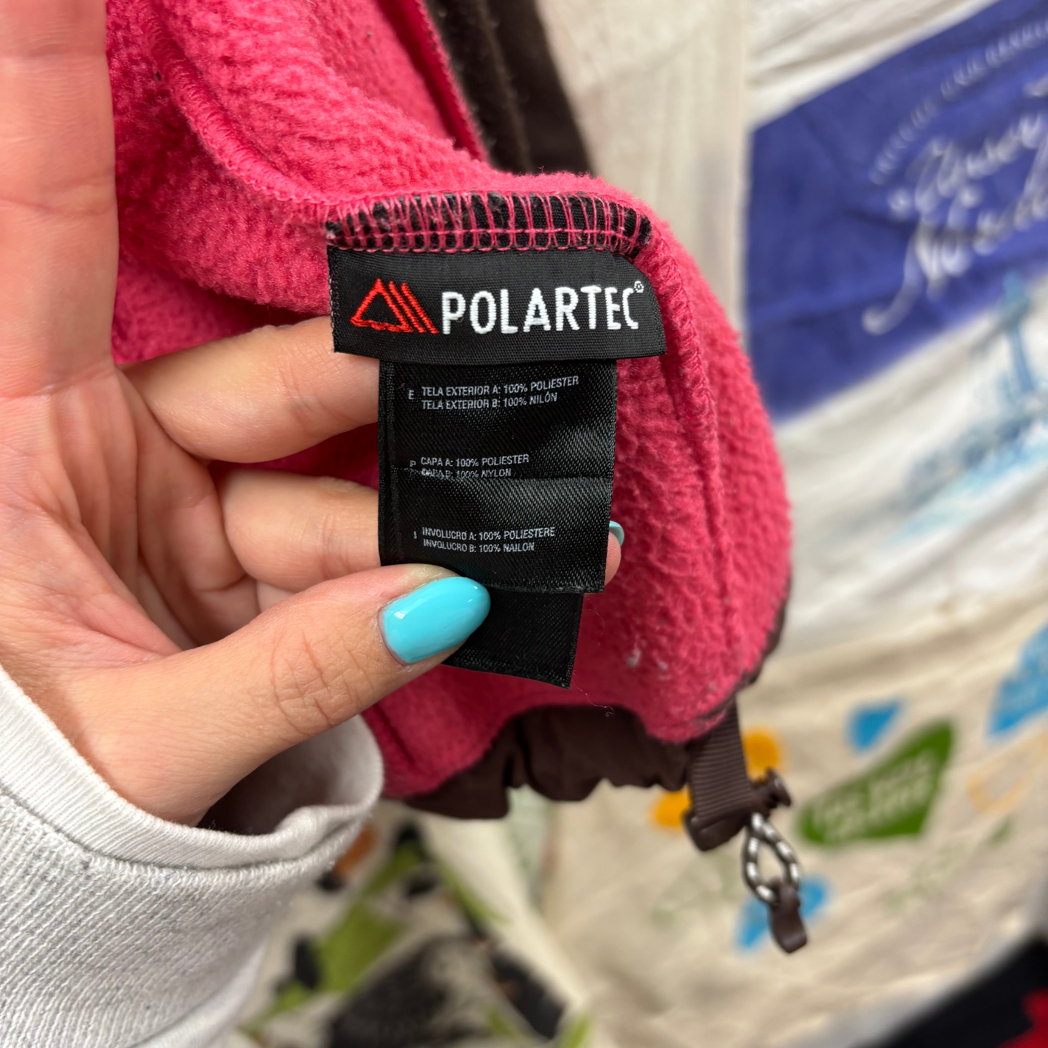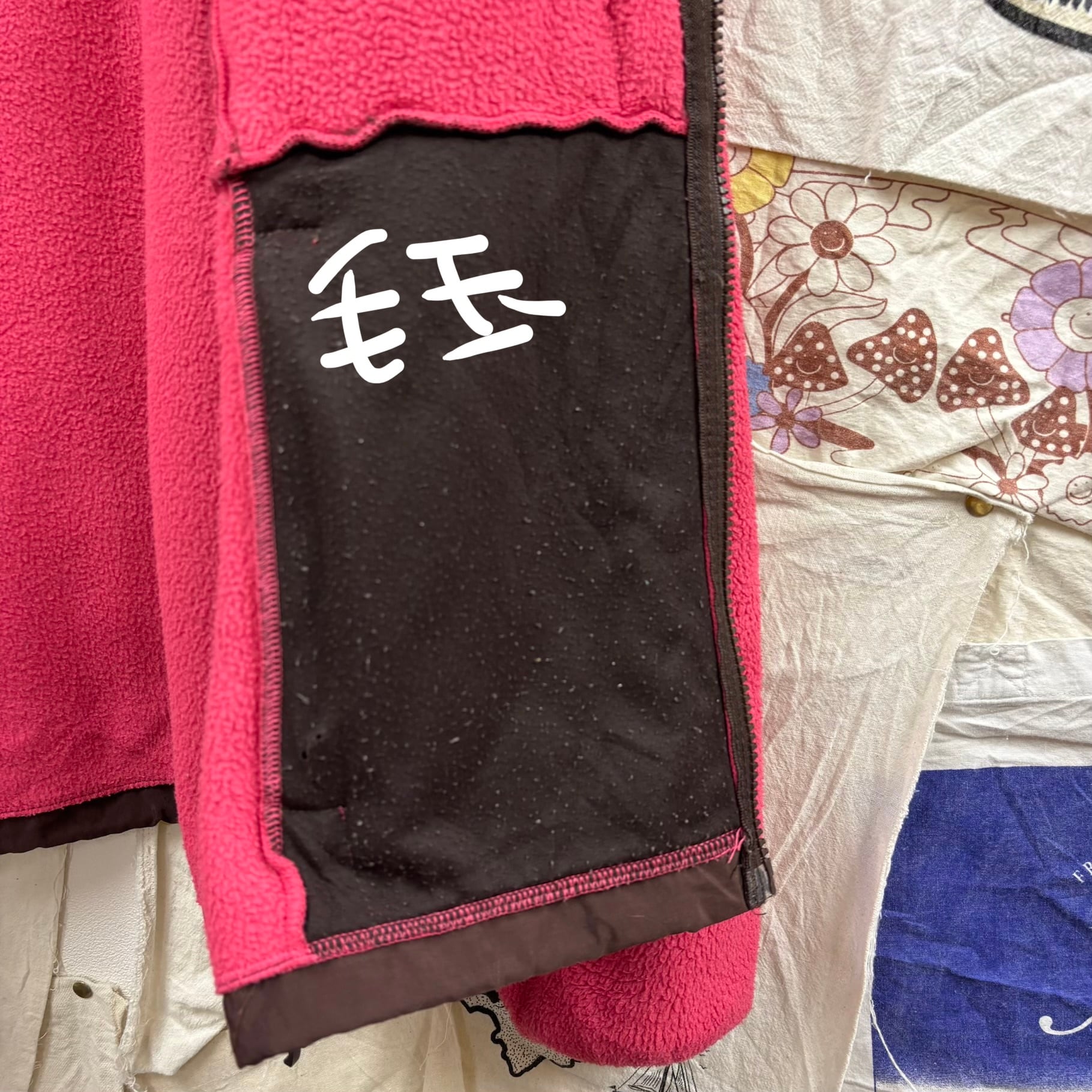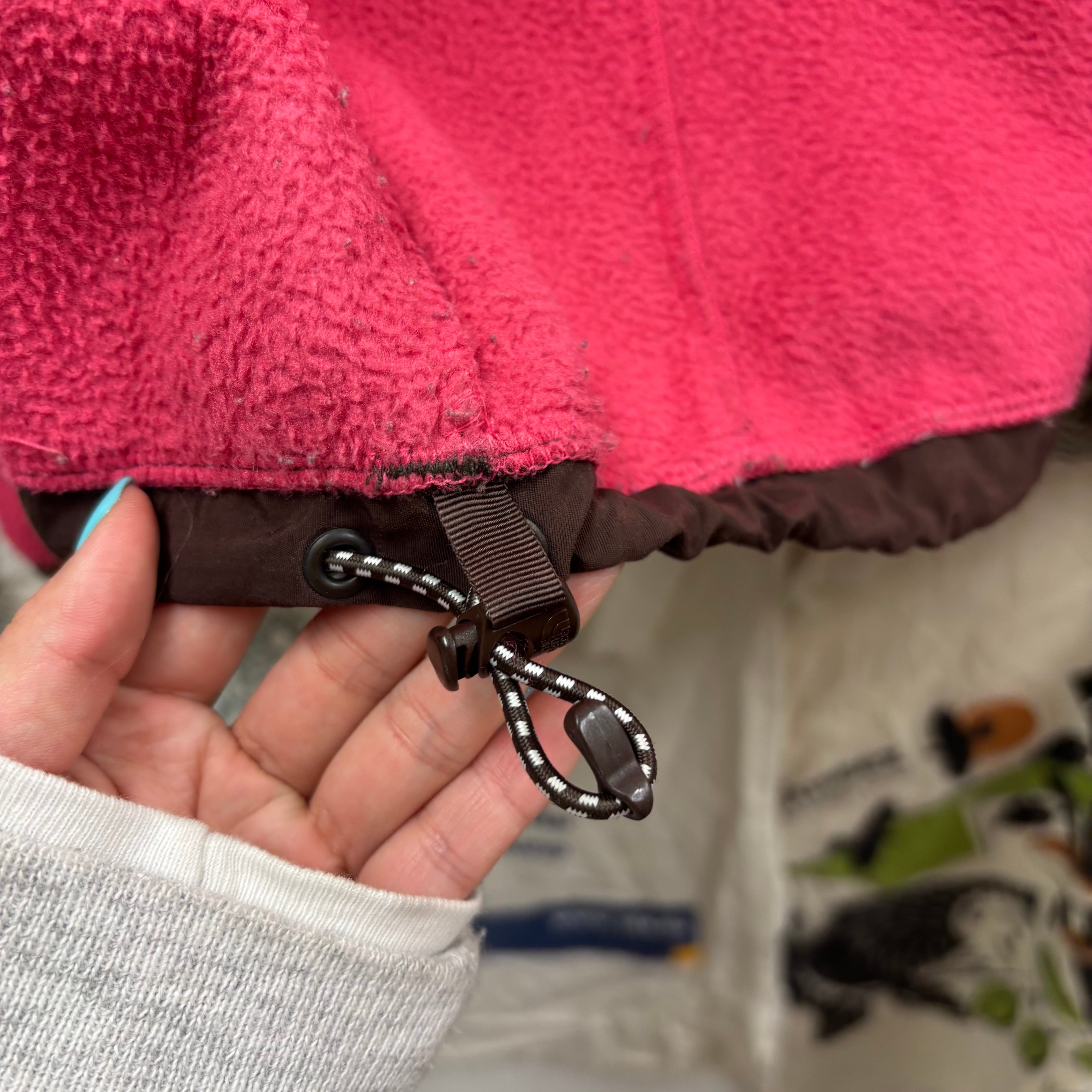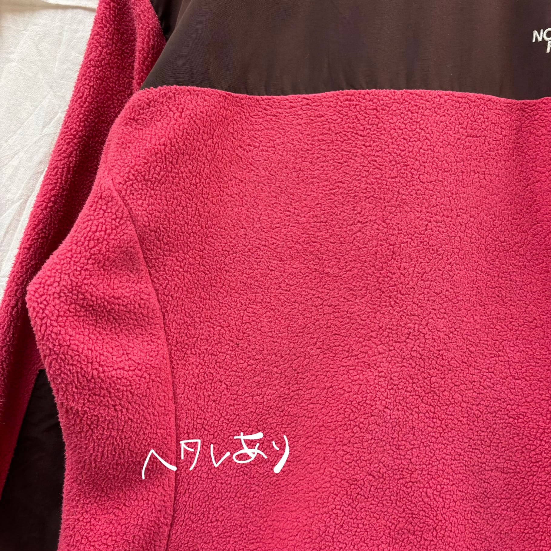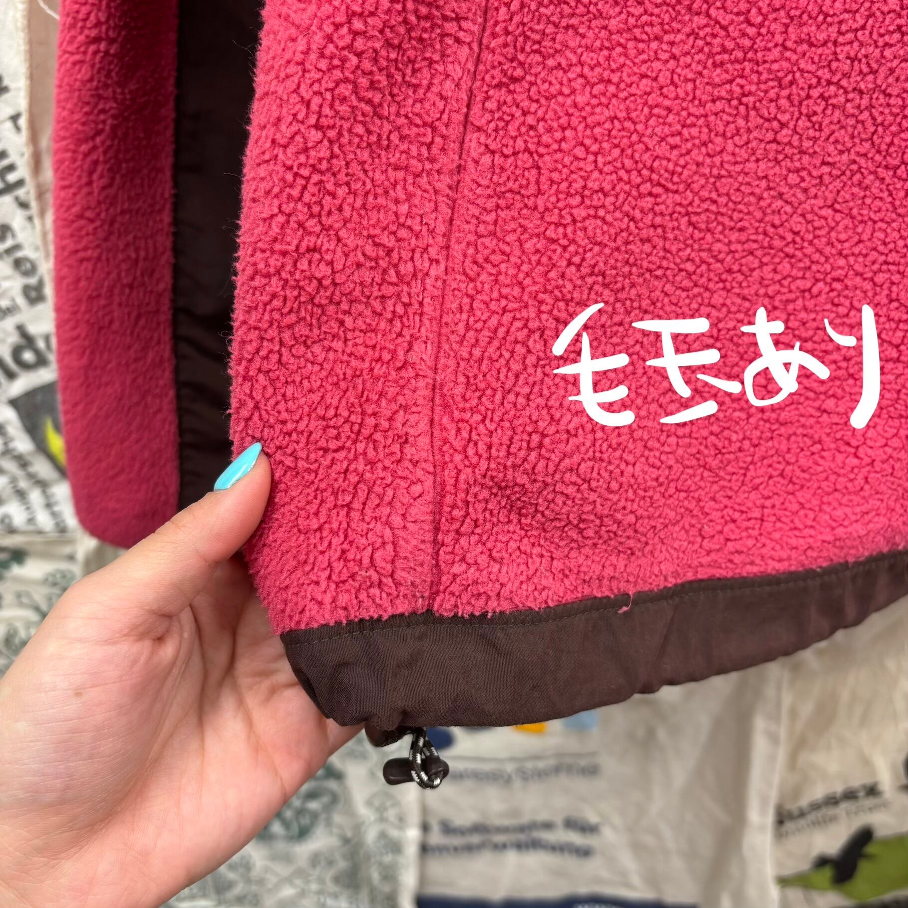 ピンクとブラウンの切り替えが目を引く、非常に珍しく可愛らしいカラーリングの一着。フリース素材で暖かく、肩や胸元のナイロン切り替えにより、バックパックを背負っても生地が傷みにくいタフな仕様になっています。