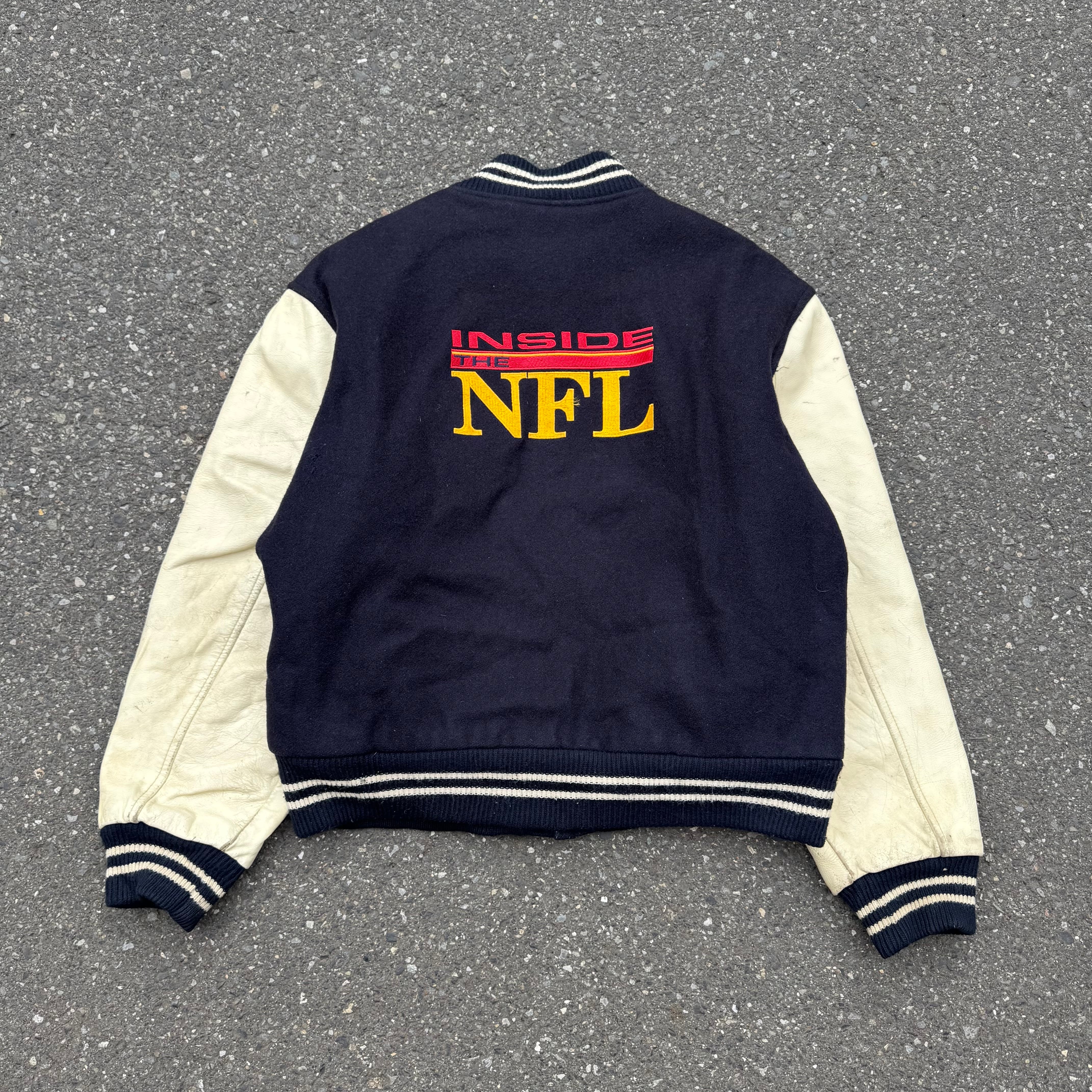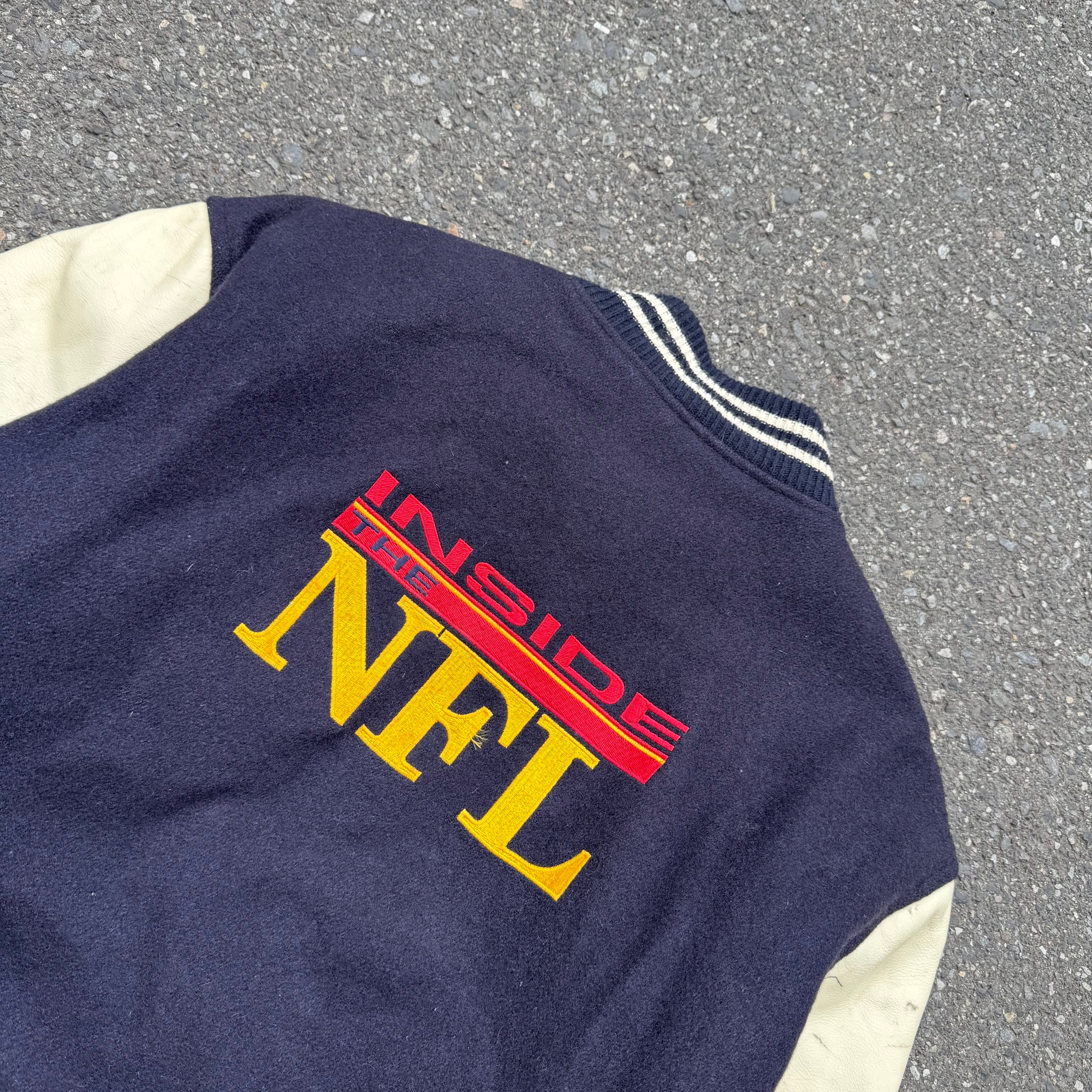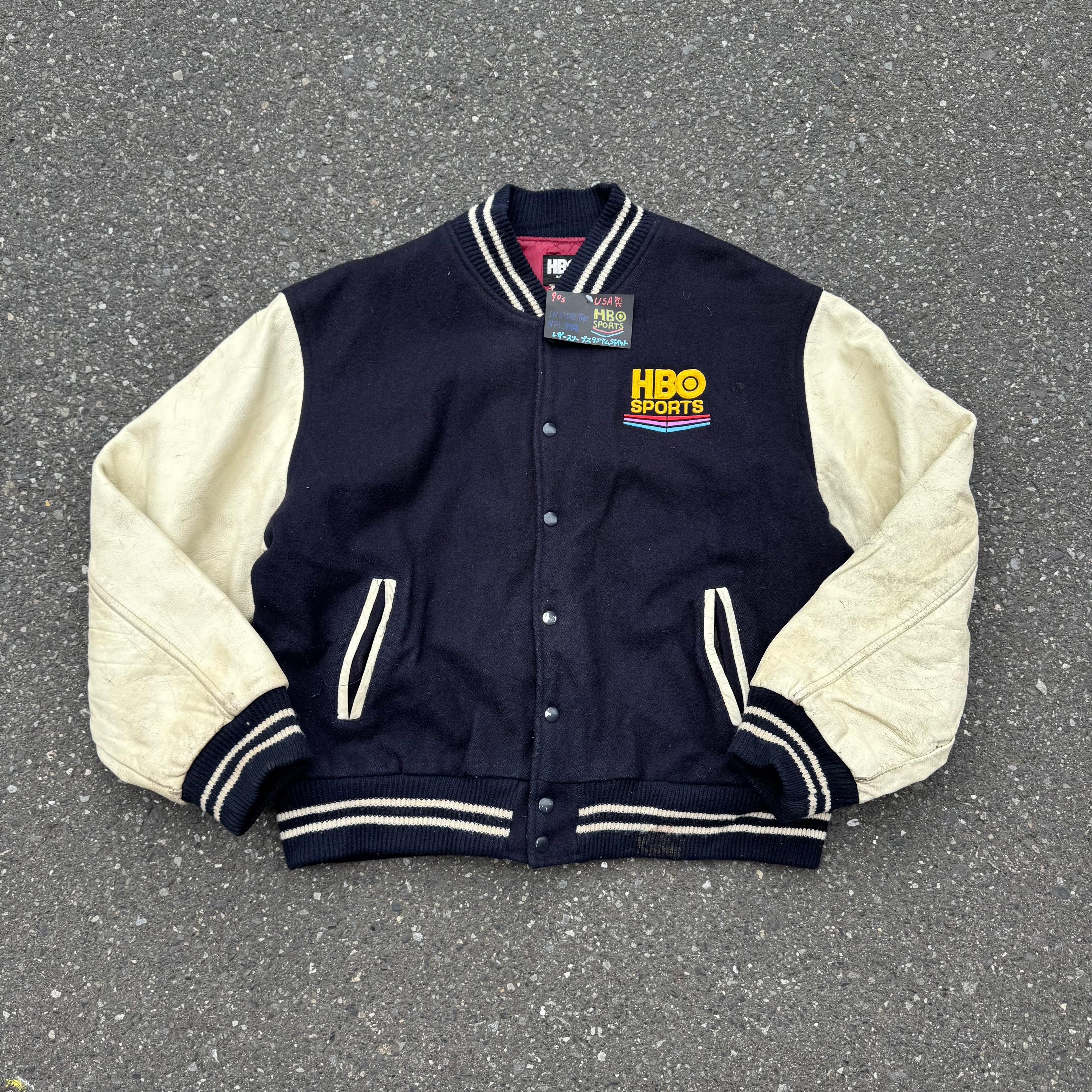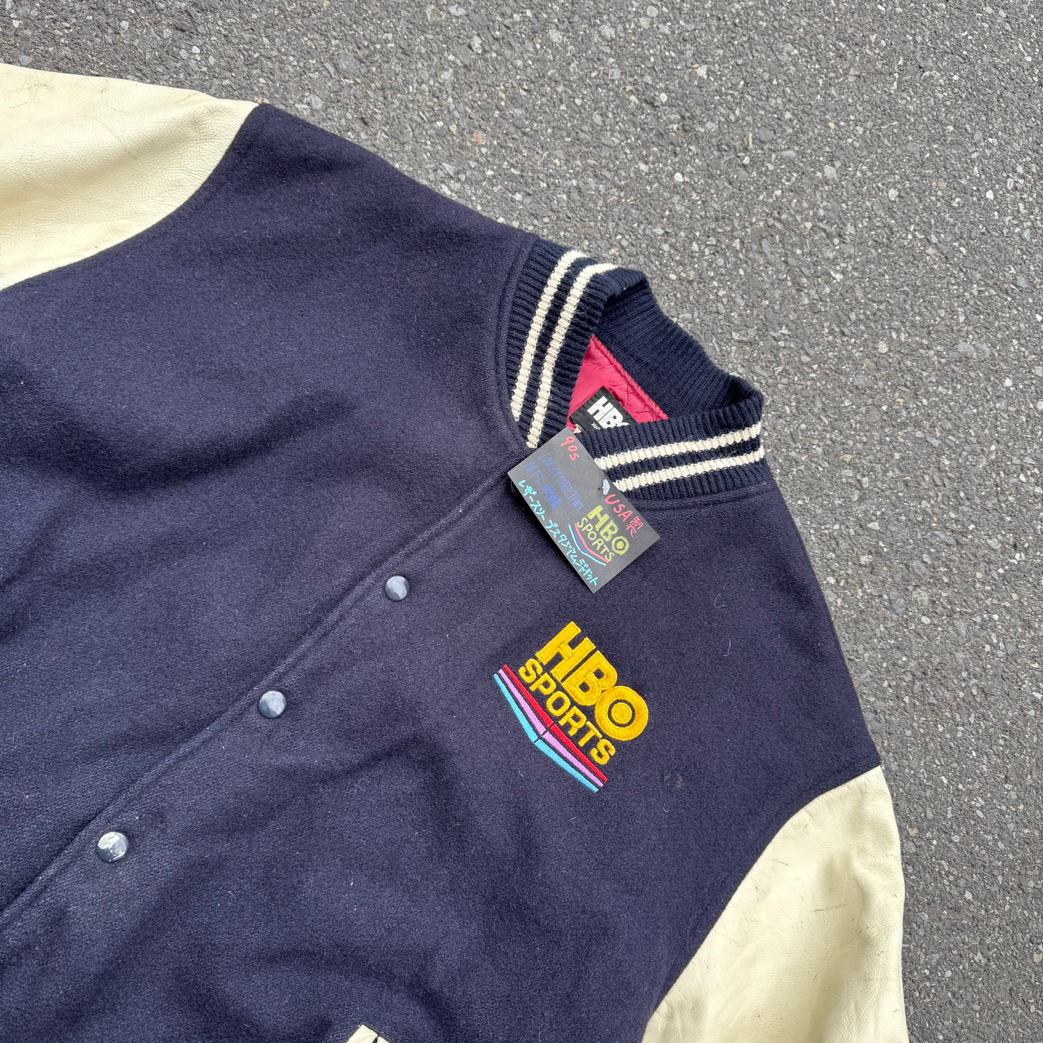 90s USA製 HBO SPORTS INSIDE THE NFL 刺繍レザースリーブスタジアムジャケット となっております。