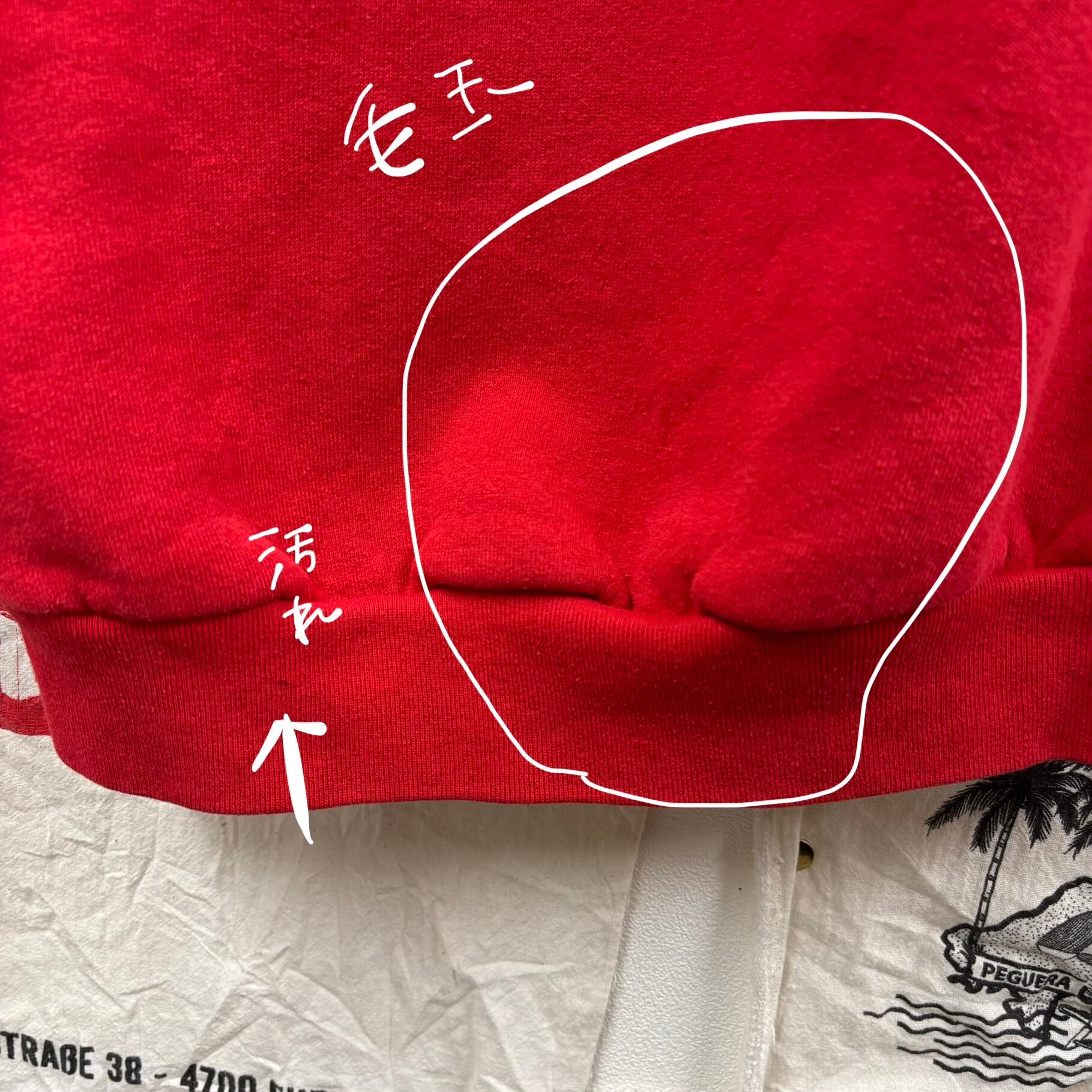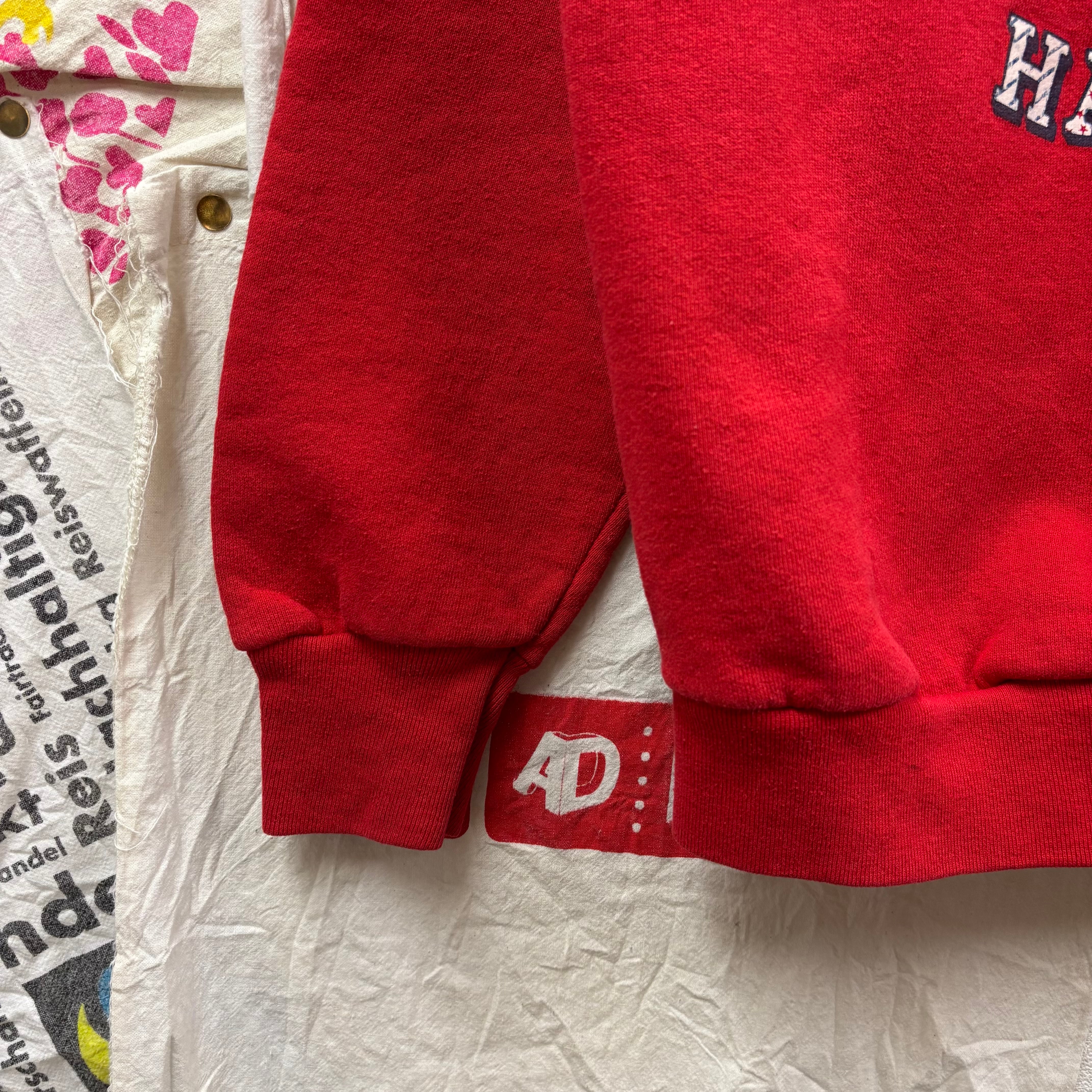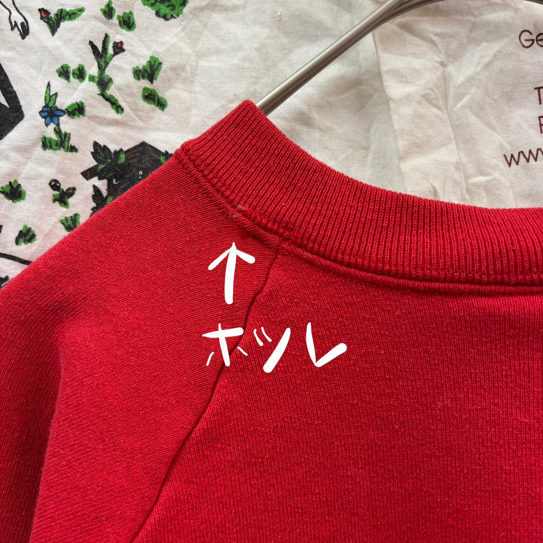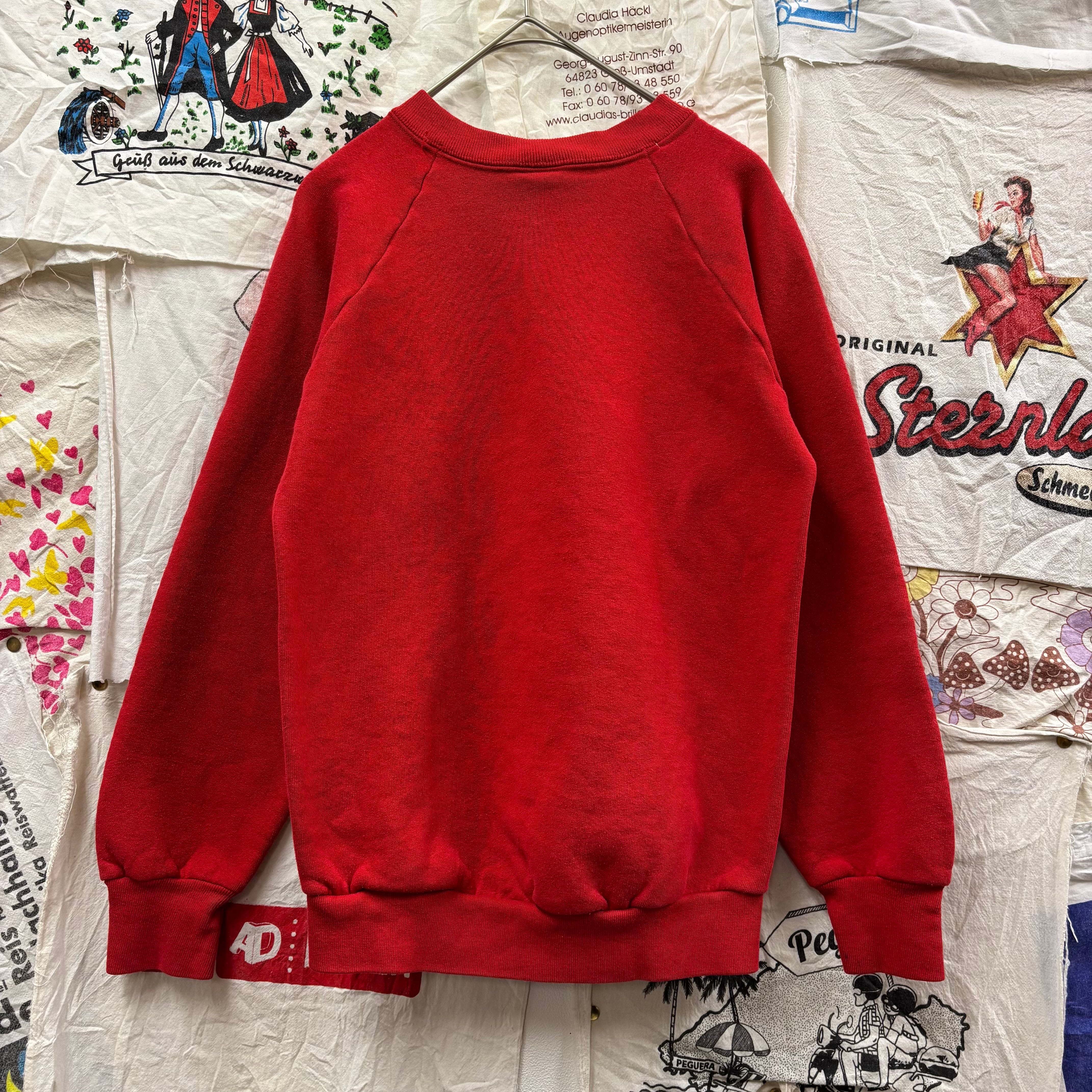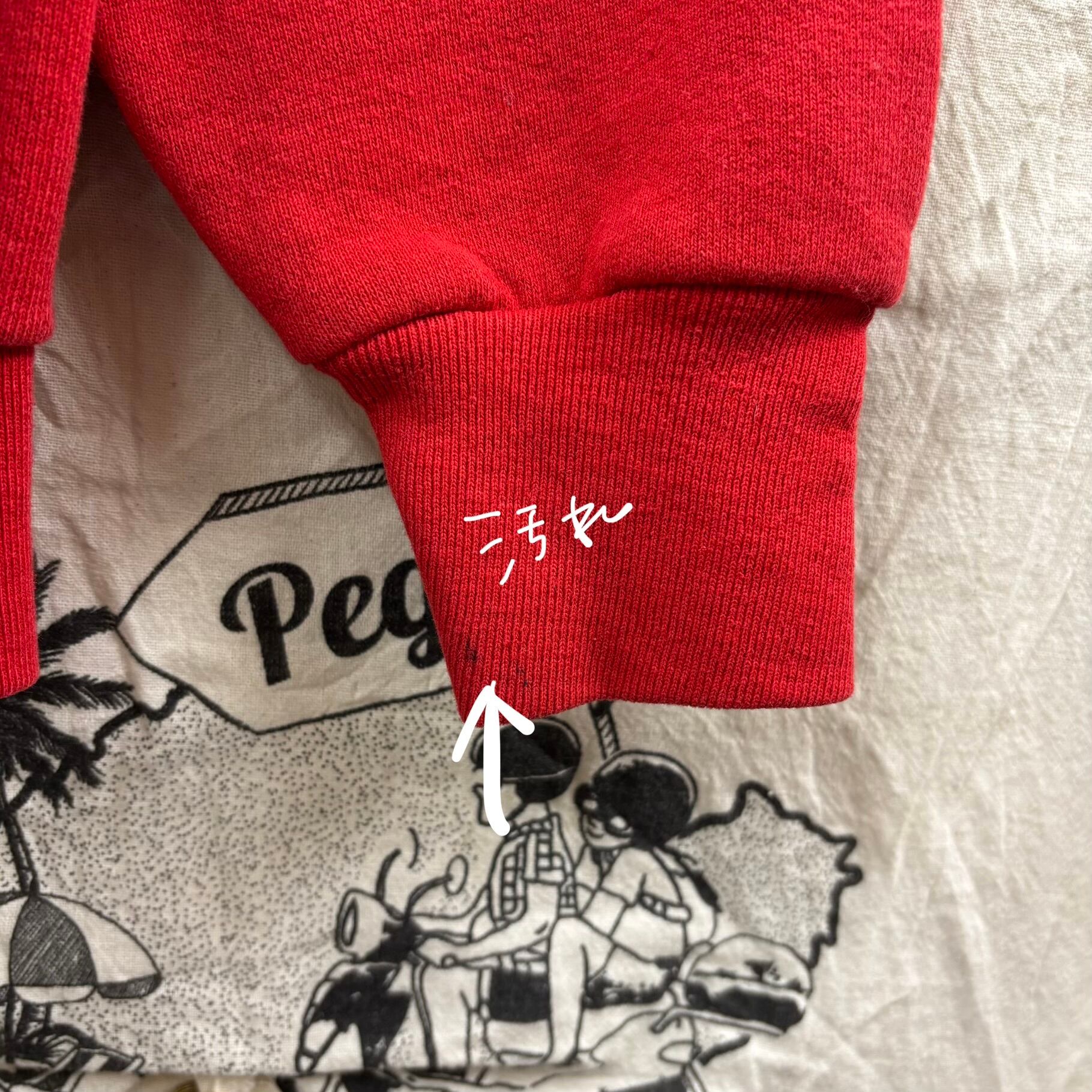 古着らしい絶妙な赤の色味が、デニムやチノパン、チェックスカートなど幅広いボトムスにマッチします。
