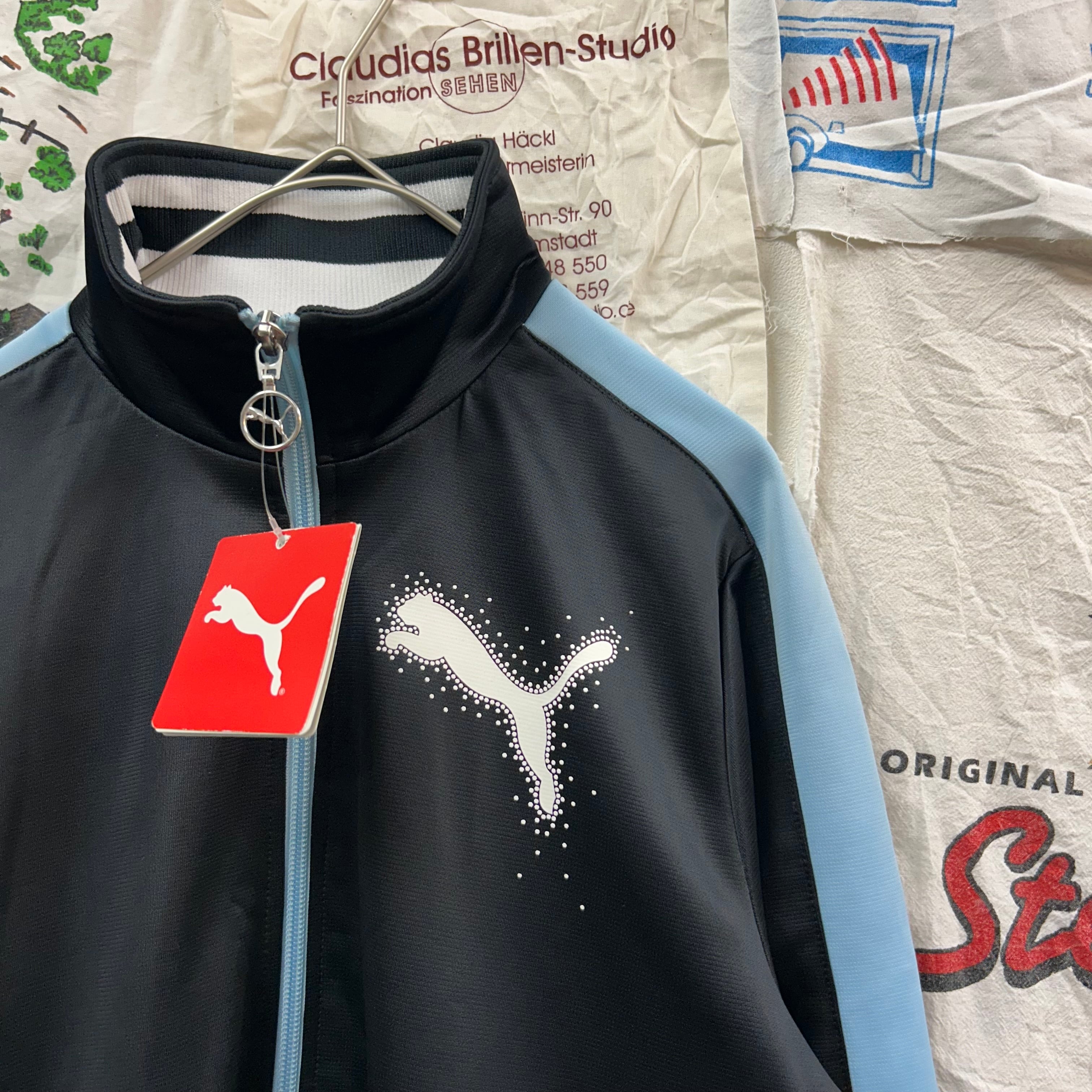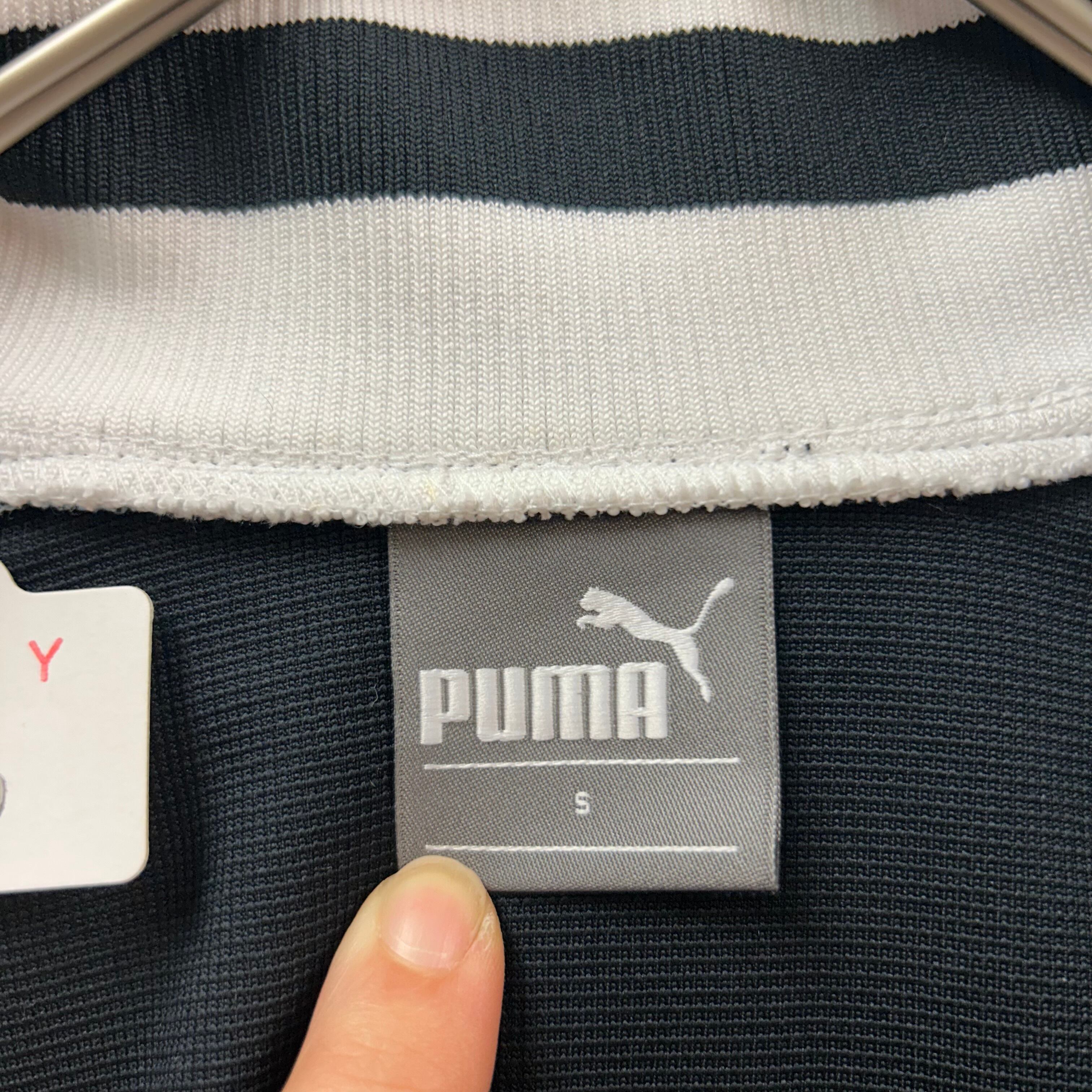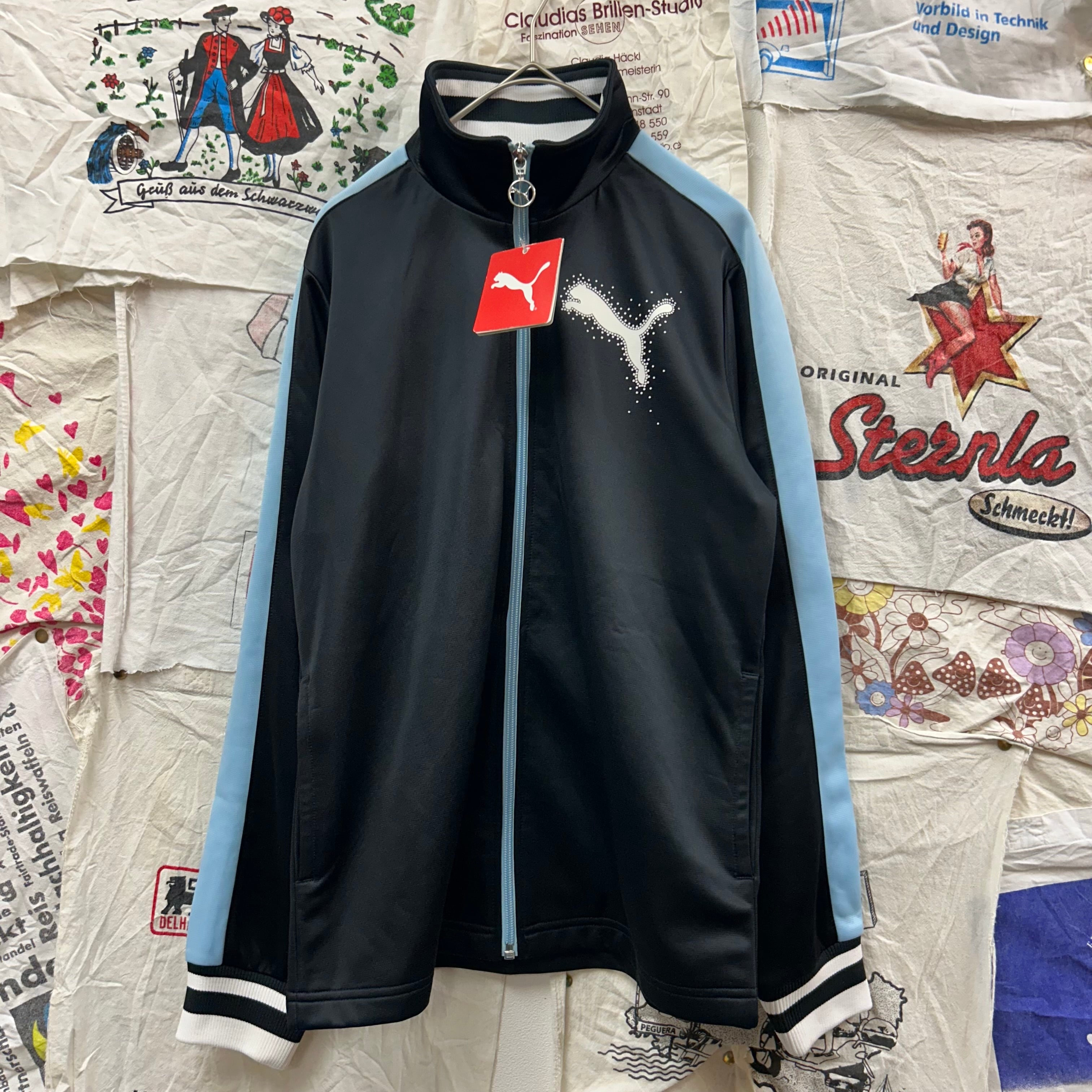 PUMA の定番スポーツジャケット。胸元や背面にシンプルなワンポイントロゴプリントが入っていて、