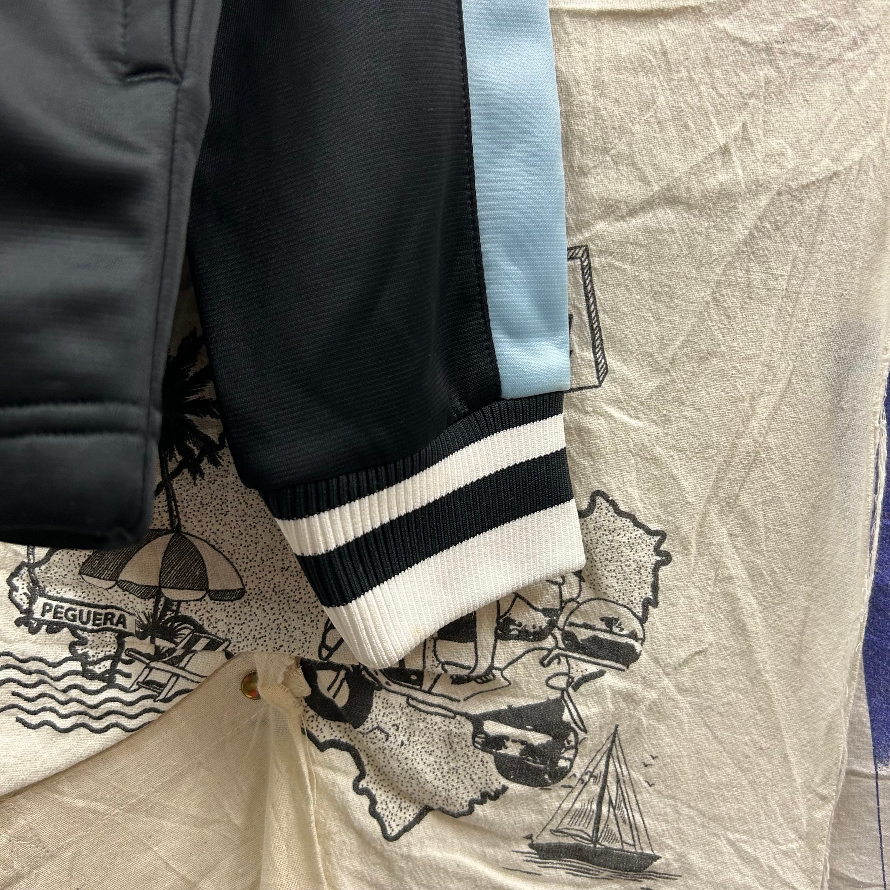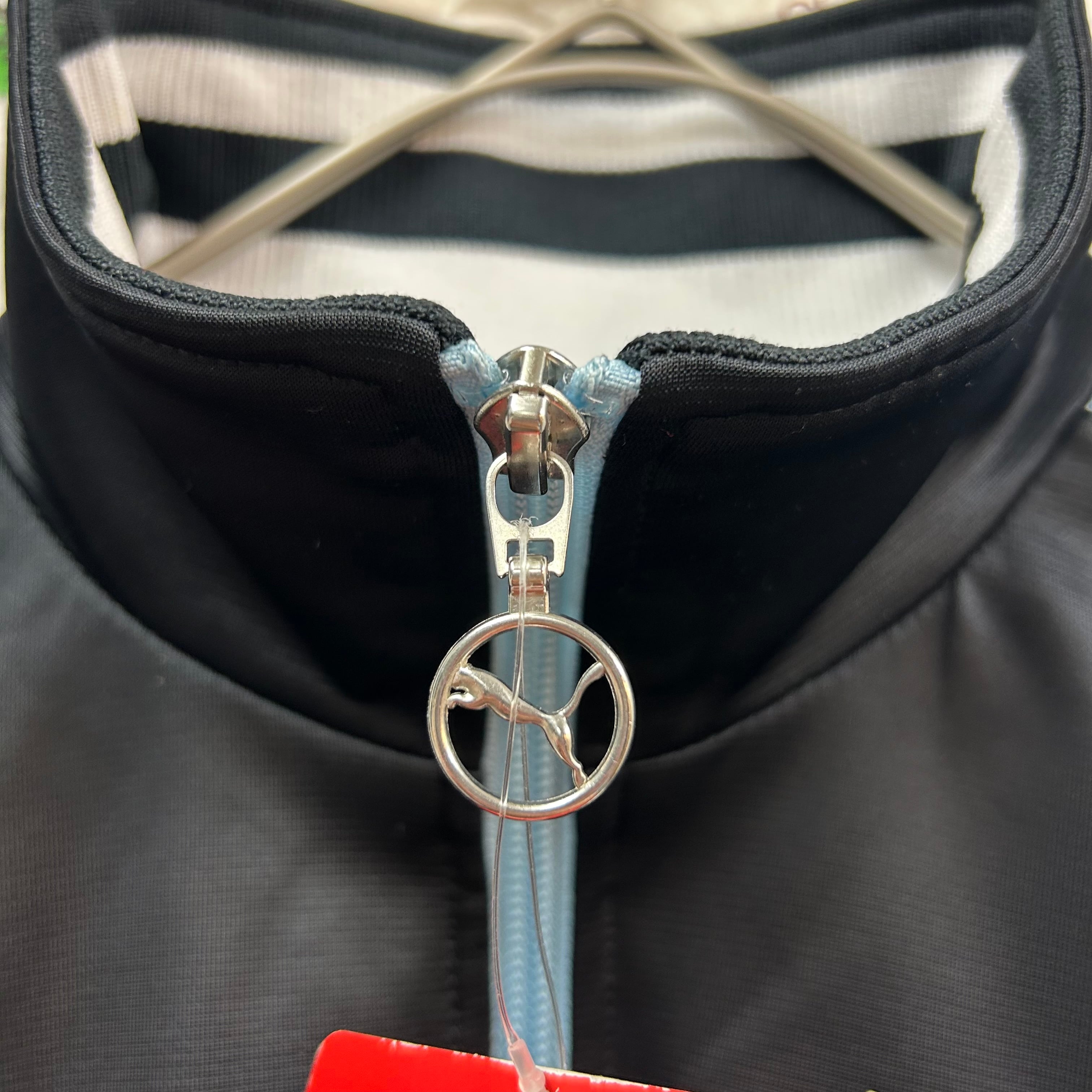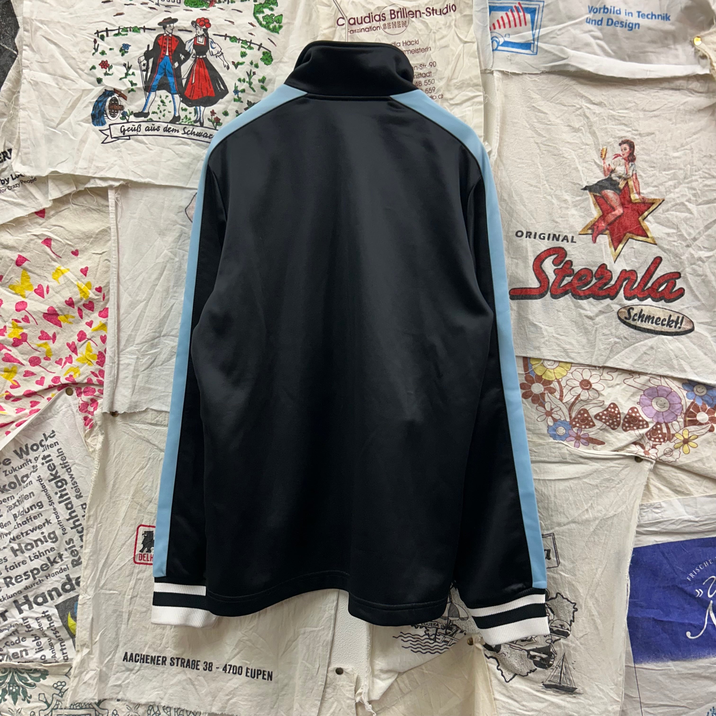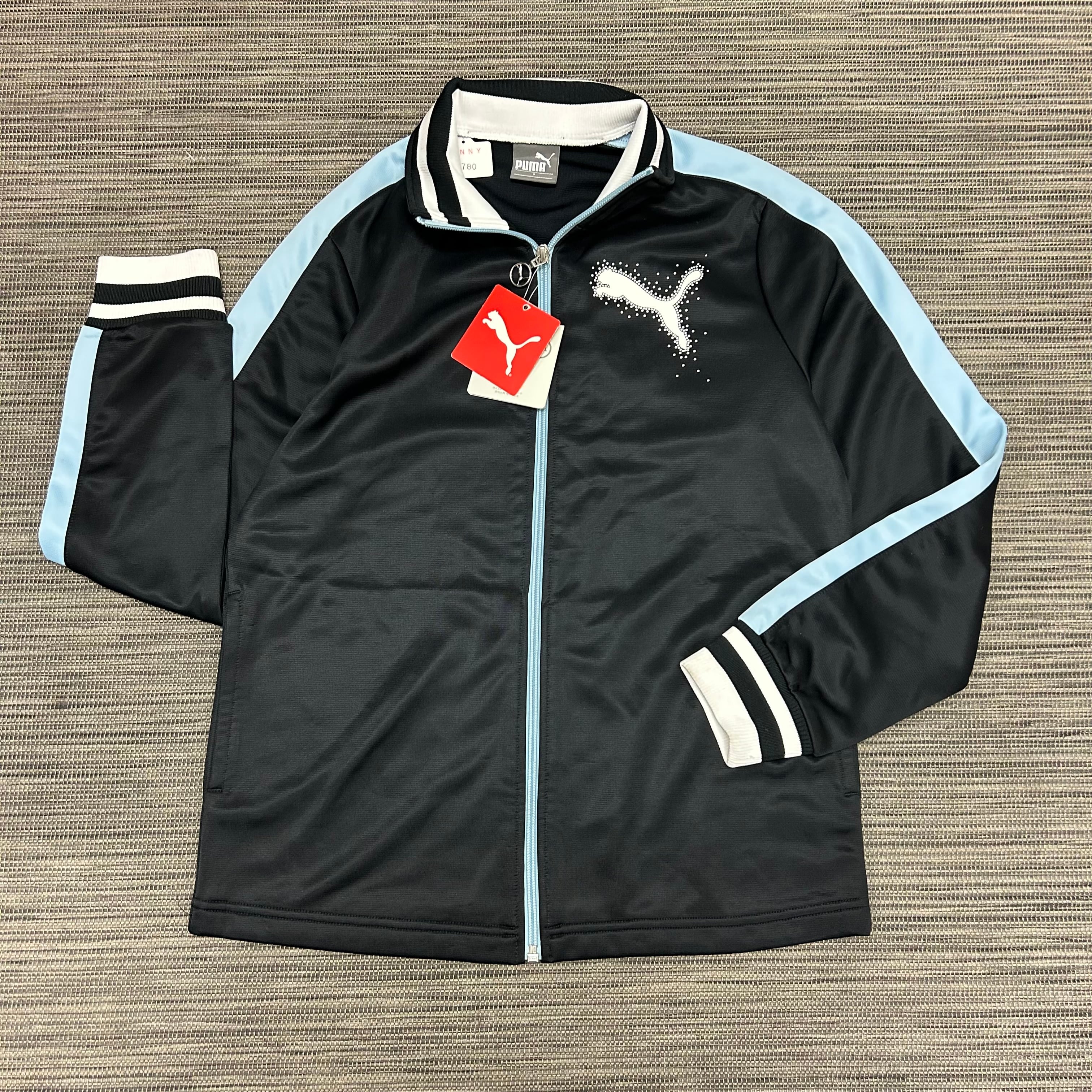 PUMA の定番スポーツジャケット。胸元や背面にシンプルなワンポイントロゴプリントが入っていて、