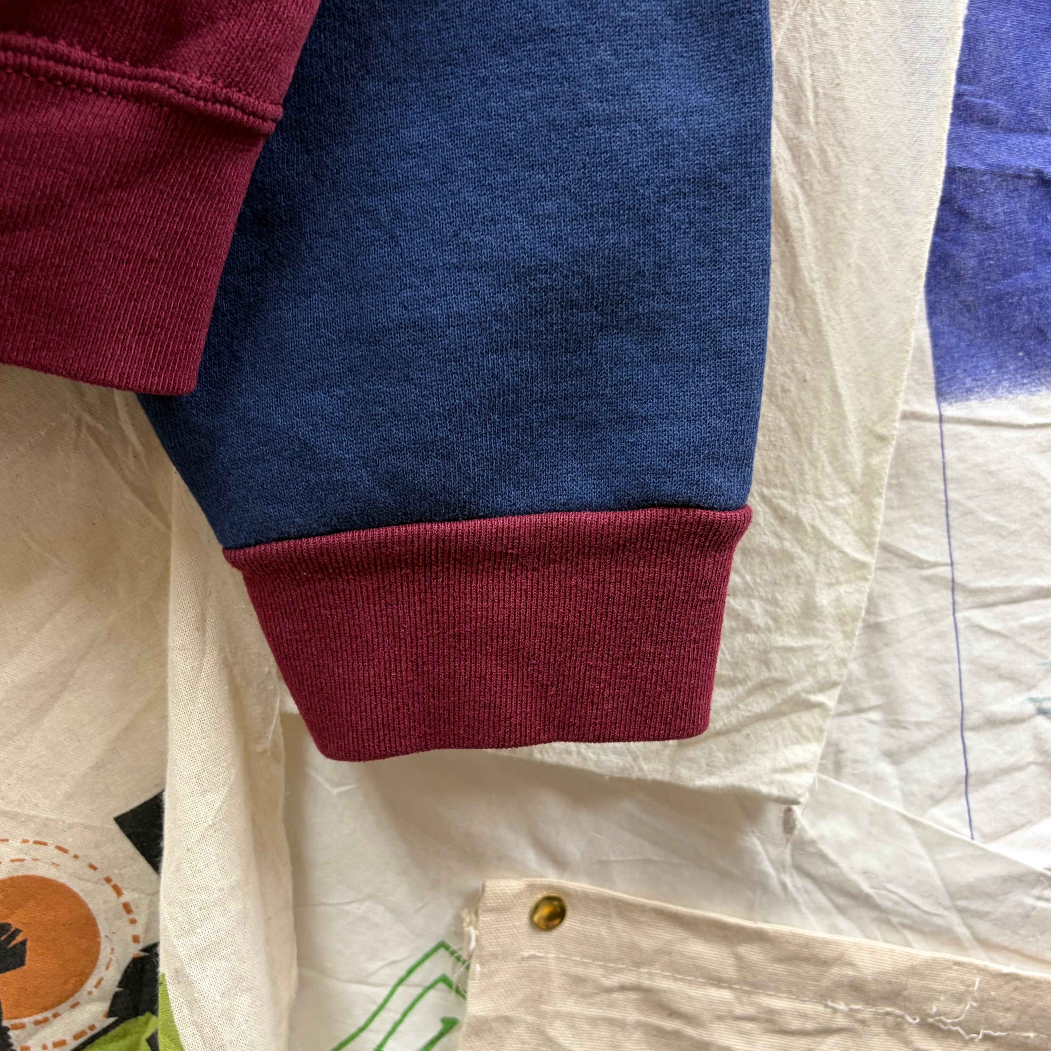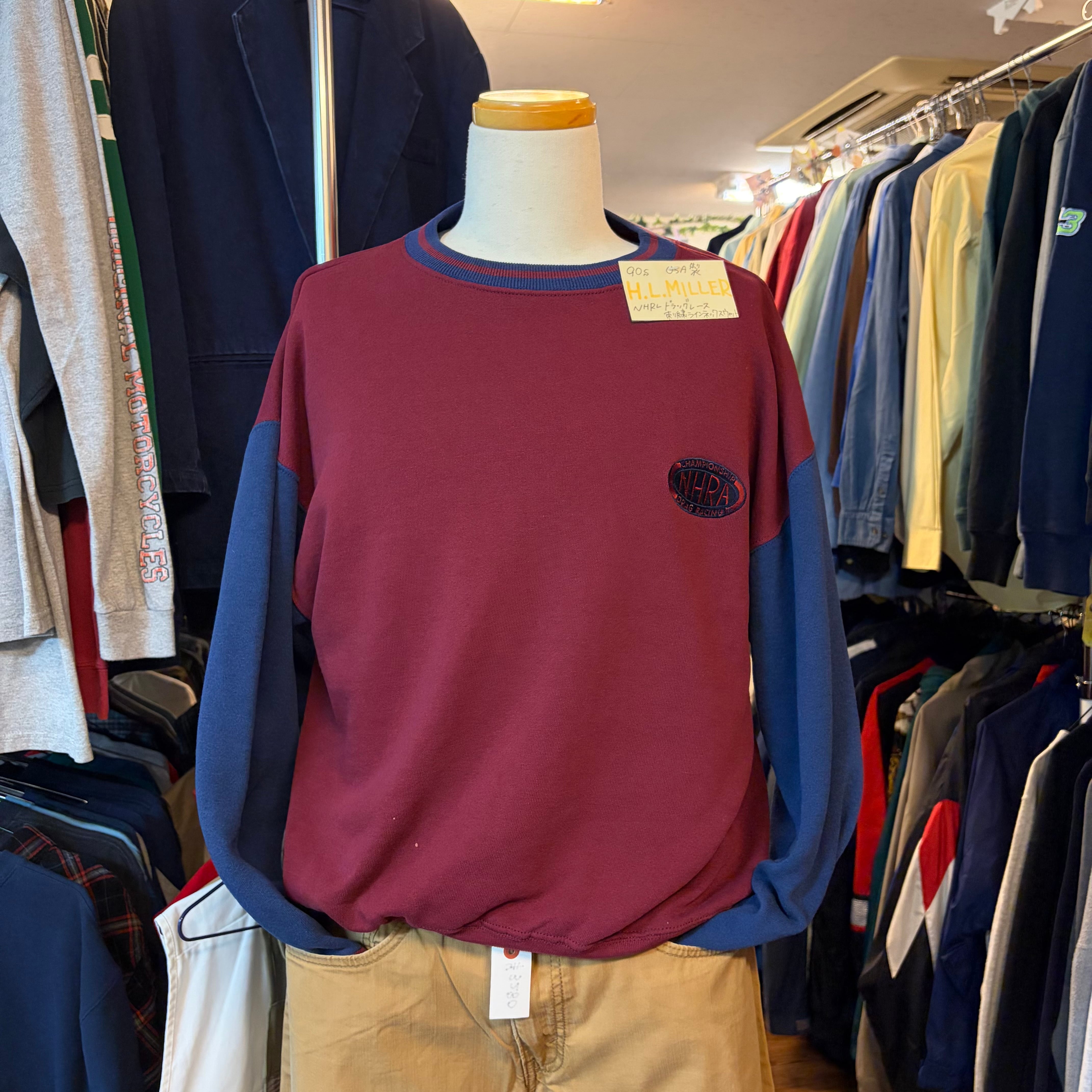 1990年代にアメリカで作られた H.L.MILLER のヴィンテージスウェットで、胸や袖に入った NHRA(アメリカのドラッグレース団体)刺繍ロゴ と、ラインネック(襟ぐりの切り替えライン)が特徴の一点。