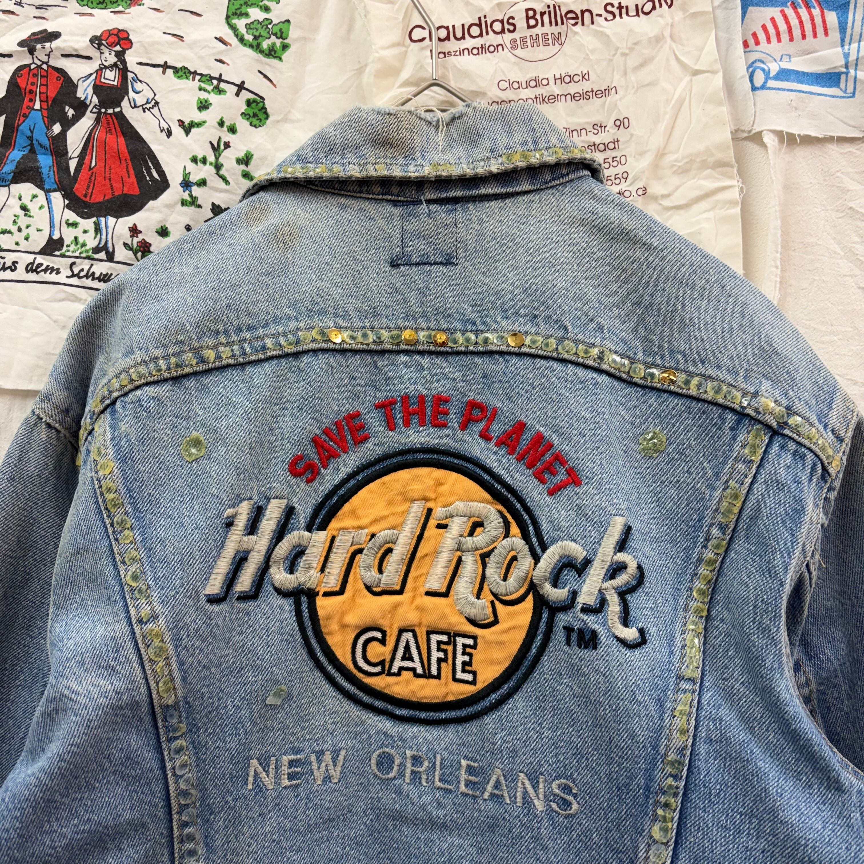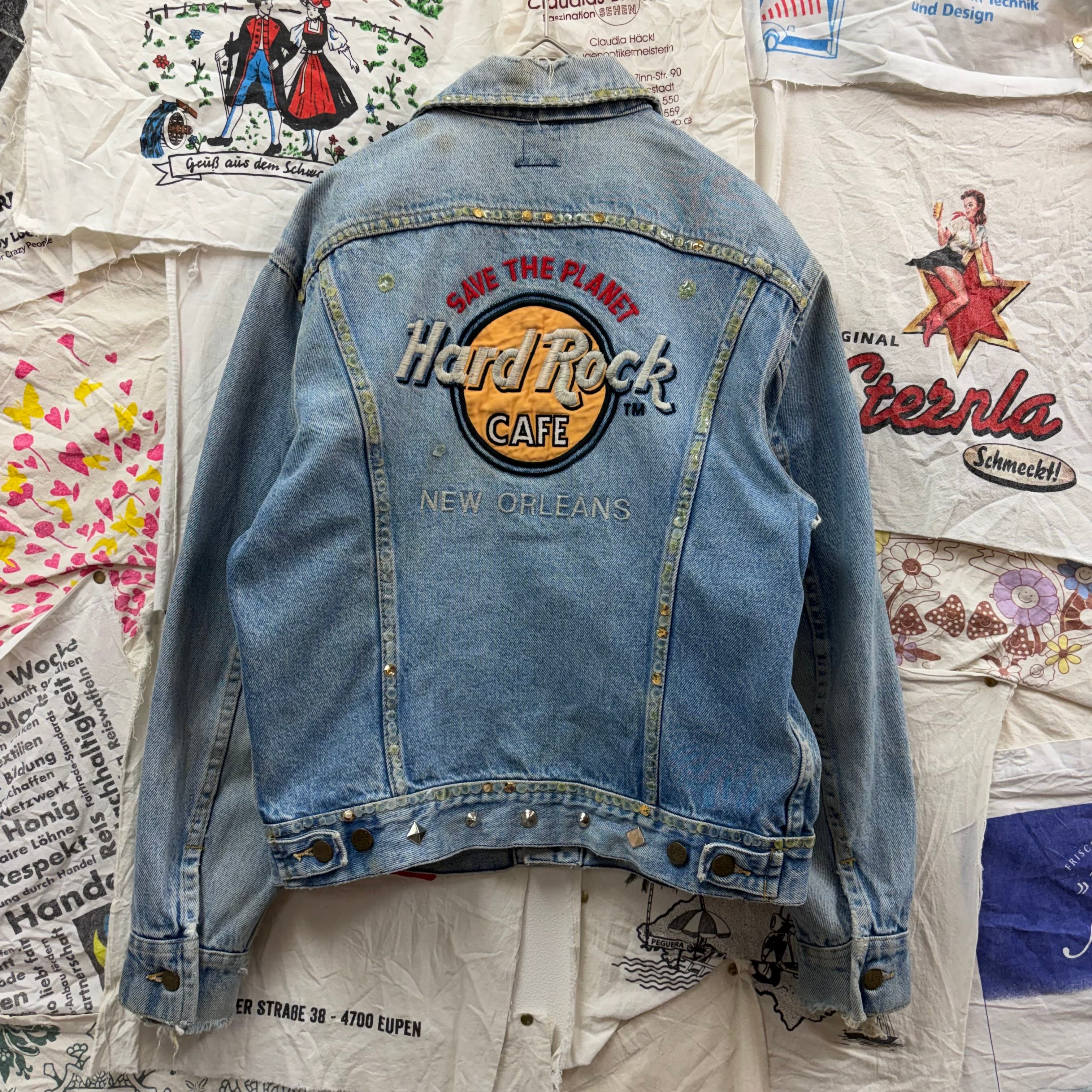 背面にHard Rock Cafeの刺繍が施されたインパクトあるリメイクデニムジャケット。