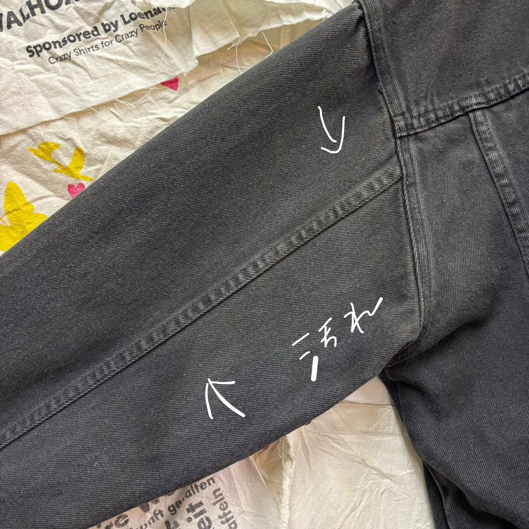 全体的にフェードしたチャコールグレーのような色落ち加減が、現行品にはない圧倒的な「味」を放っています。短めの着丈に広めの身幅という、90年代特有のボックスシルエットは、今のトレンドであるクロップド丈やハイウエストパンツとも相性抜群です。