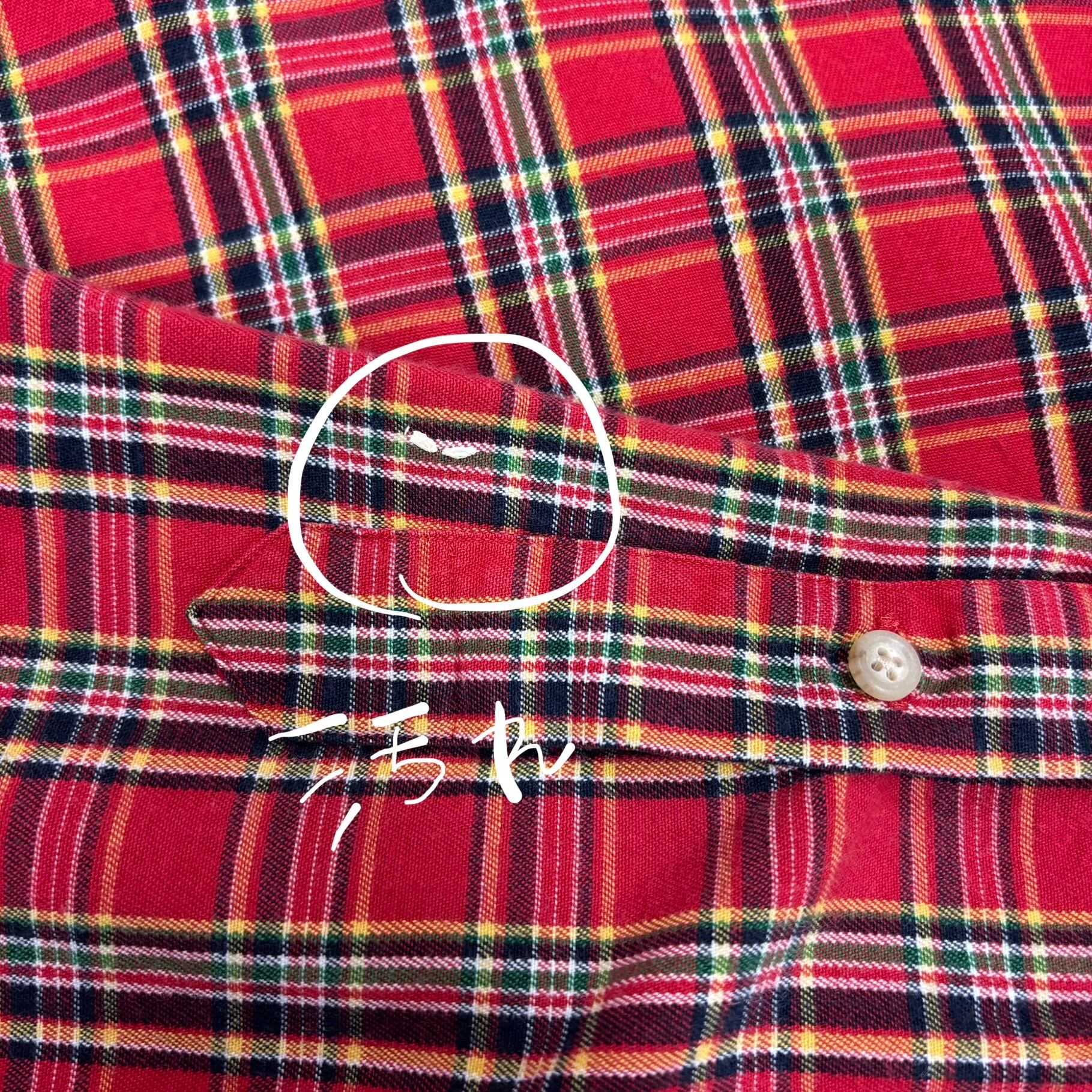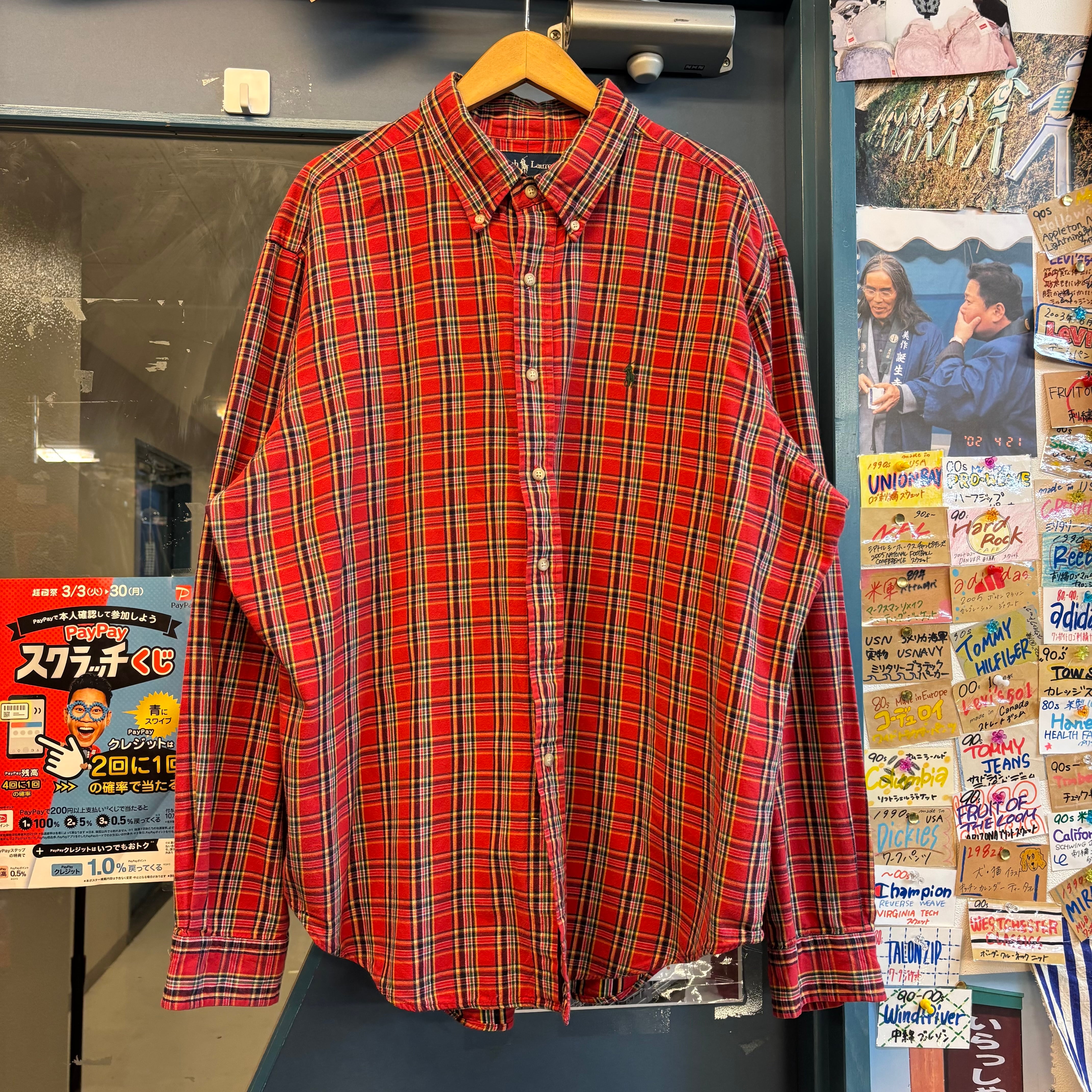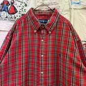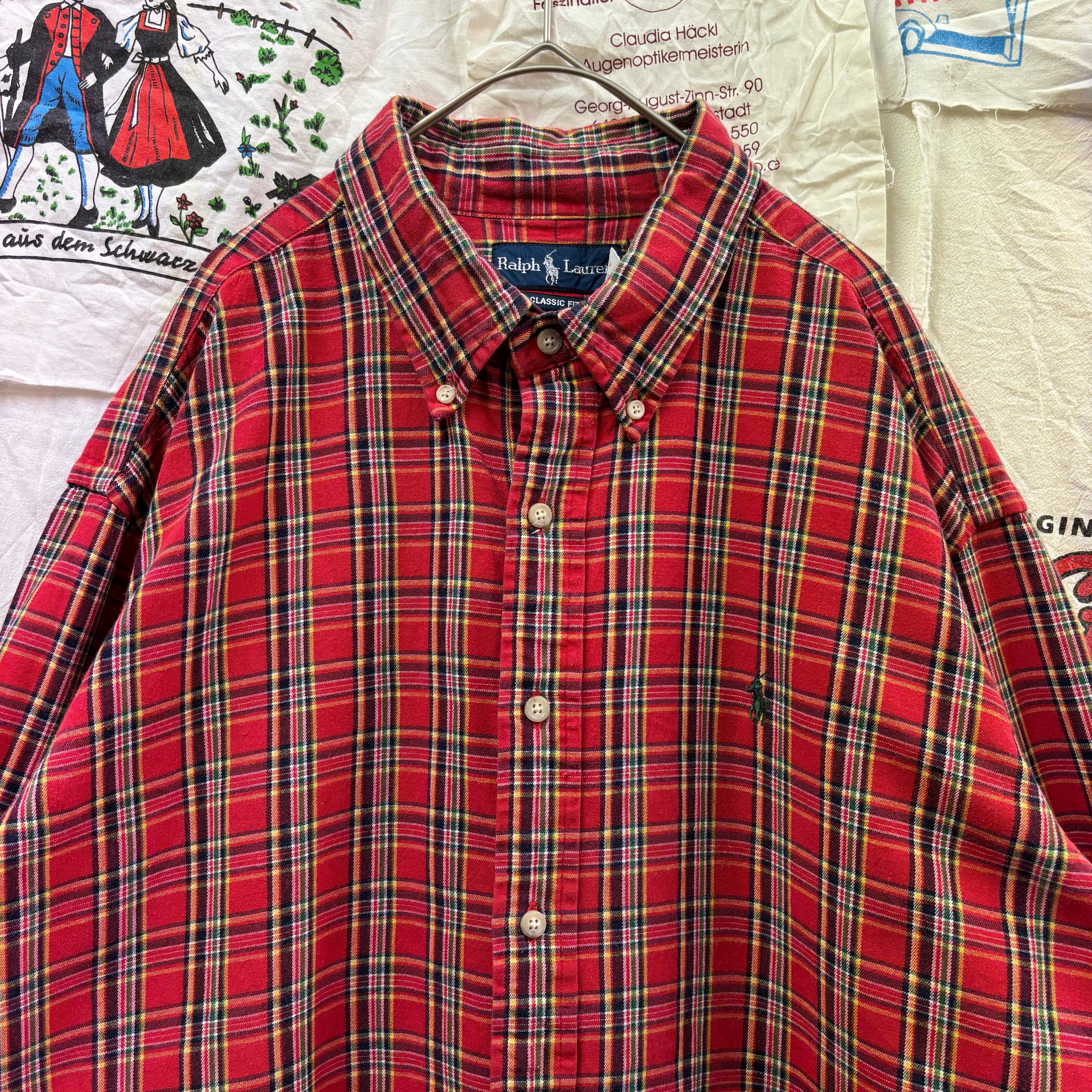 パッと目を惹く深みのあるレッドをベースに、ネイビーやイエロー、グリーンを配した好配色のタータンチェック。ラルフローレンのシャツの中でも、この王道の配色は非常に人気が高く、古着市場でも常に動きが早いアイテムです。