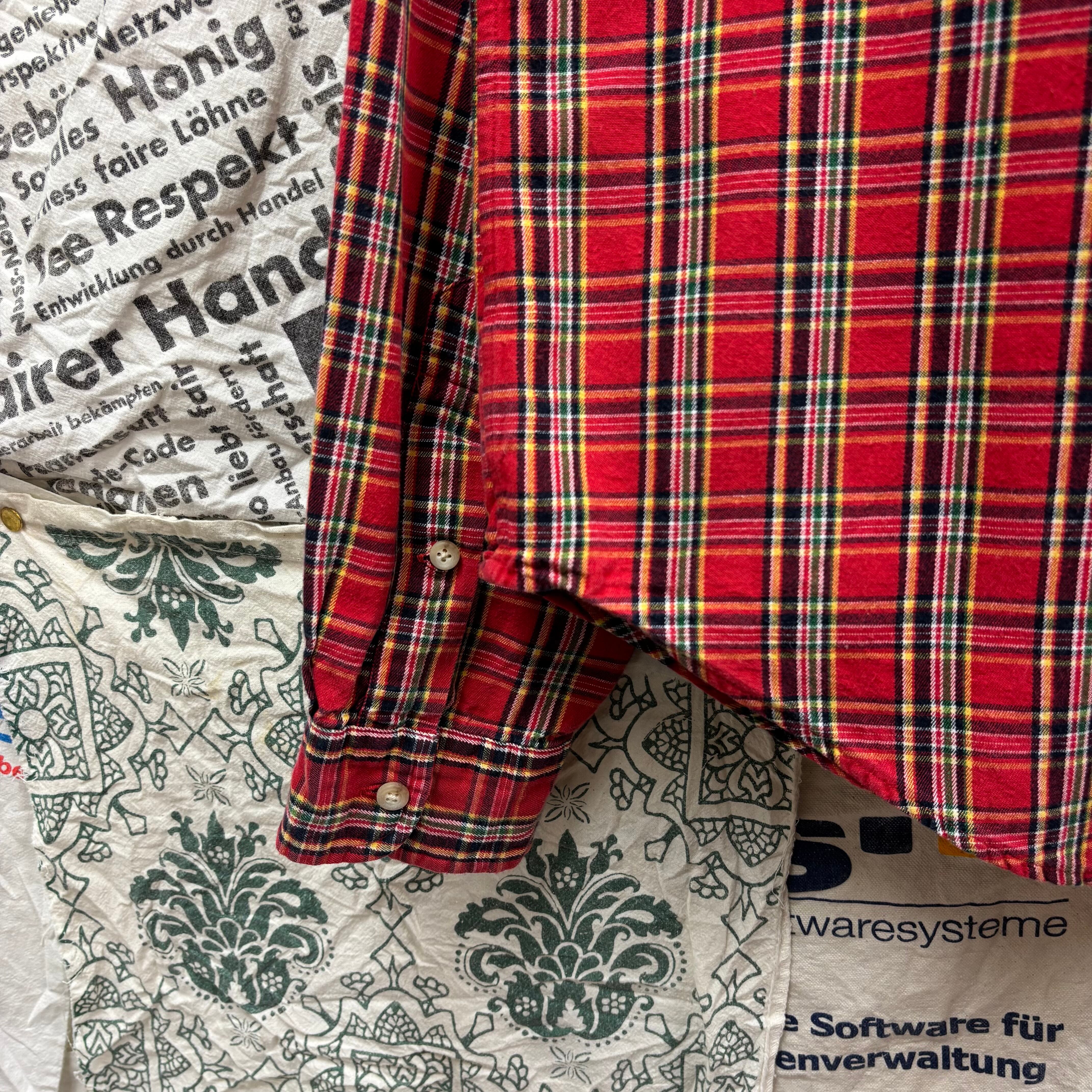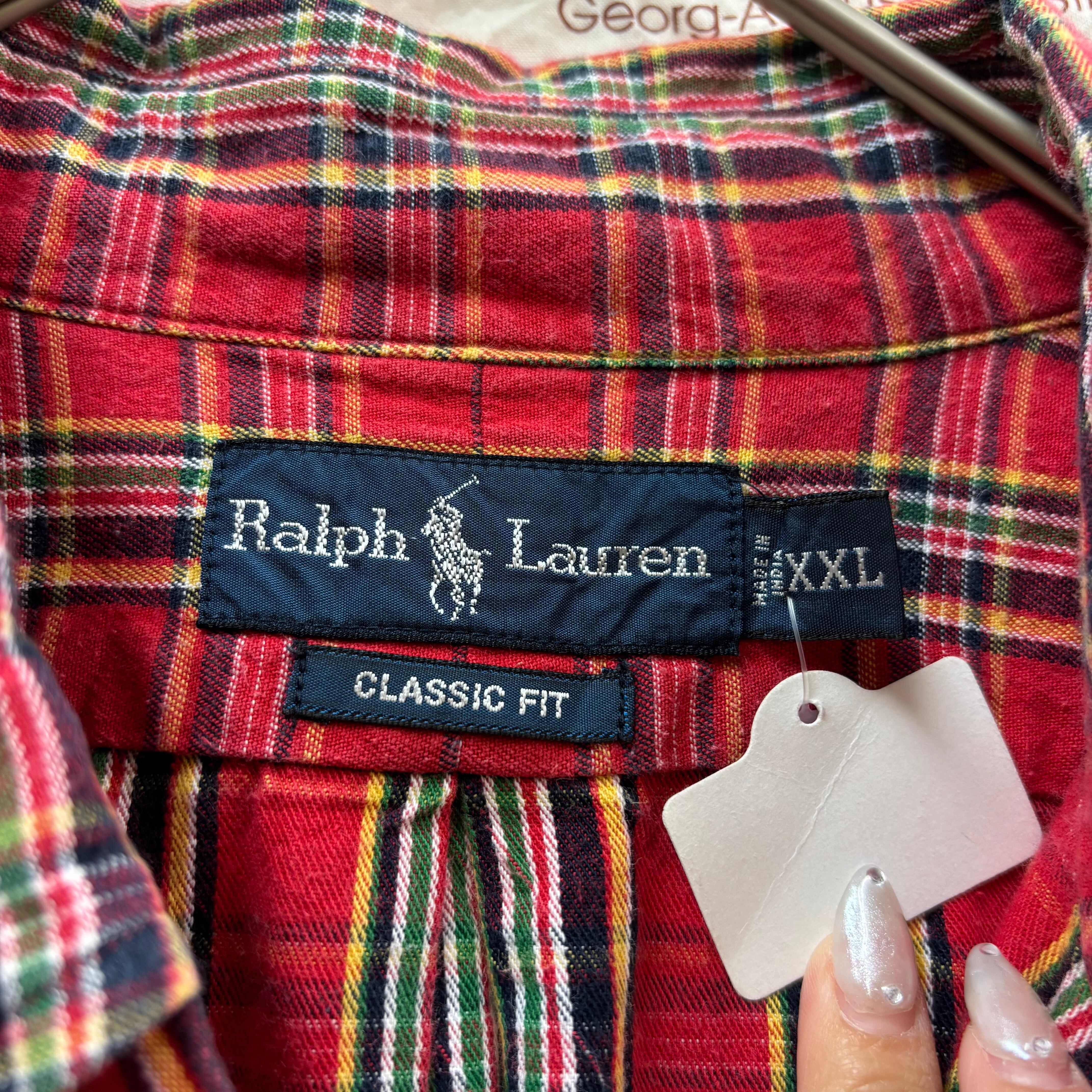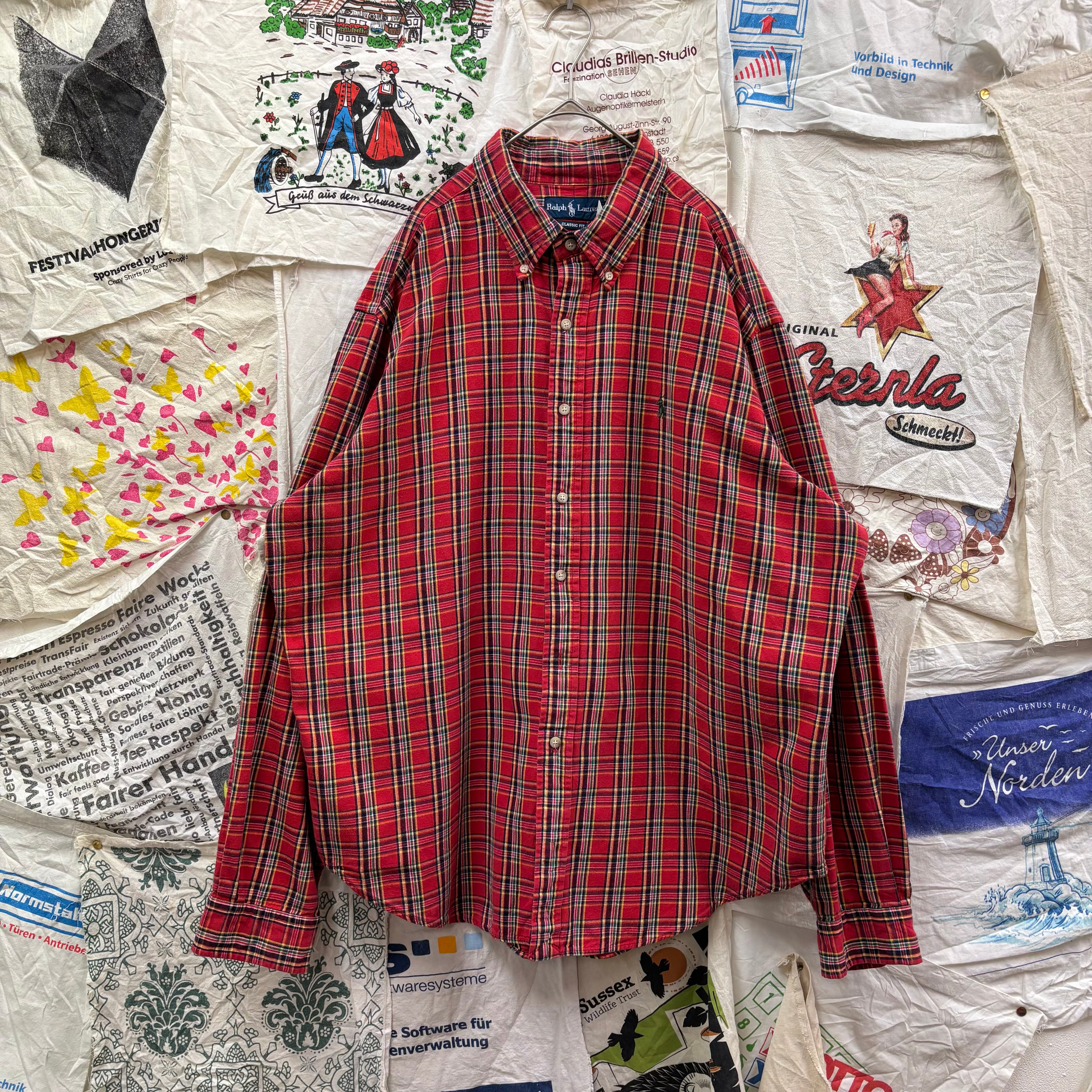 パッと目を惹く深みのあるレッドをベースに、ネイビーやイエロー、グリーンを配した好配色のタータンチェック。ラルフローレンのシャツの中でも、この王道の配色は非常に人気が高く、古着市場でも常に動きが早いアイテムです。