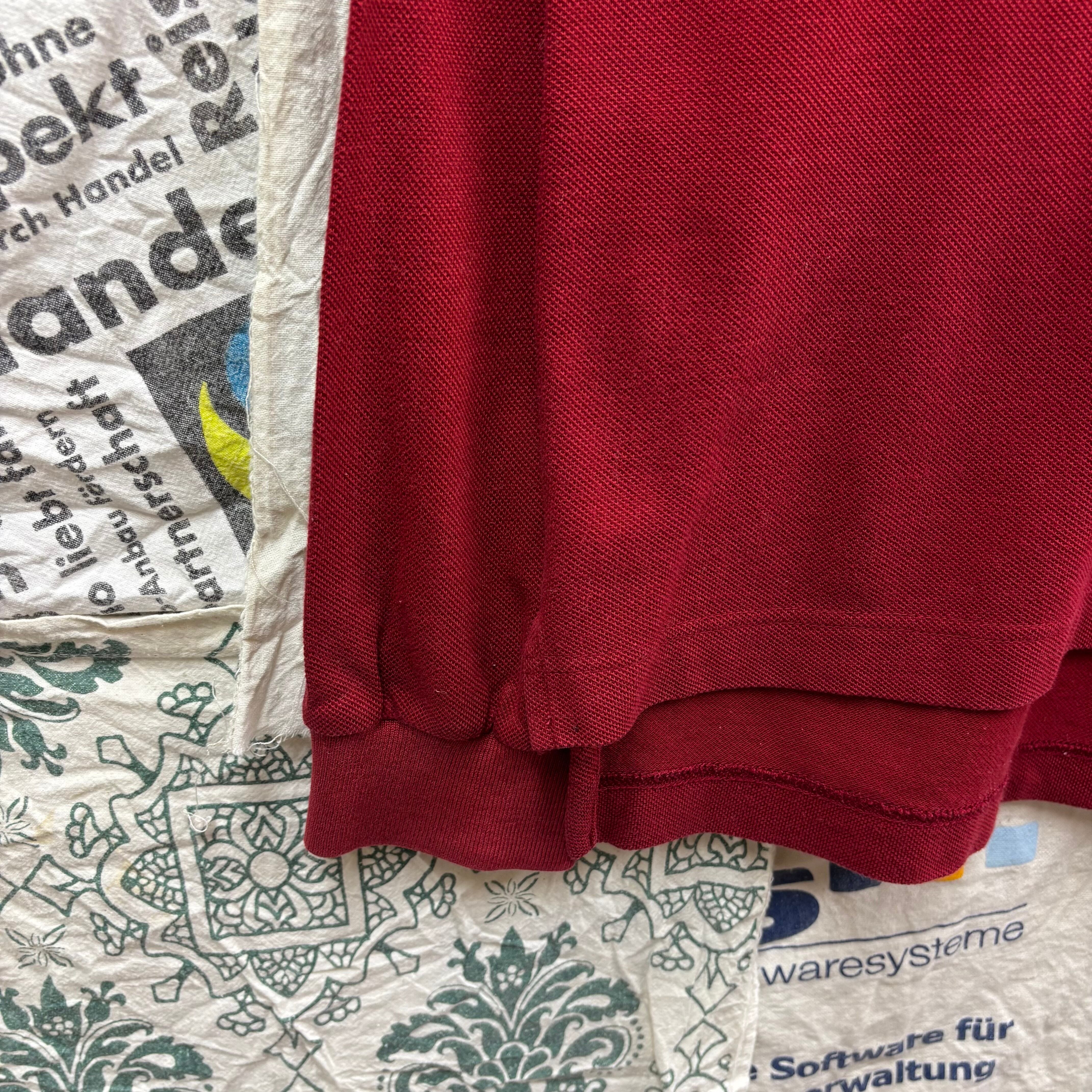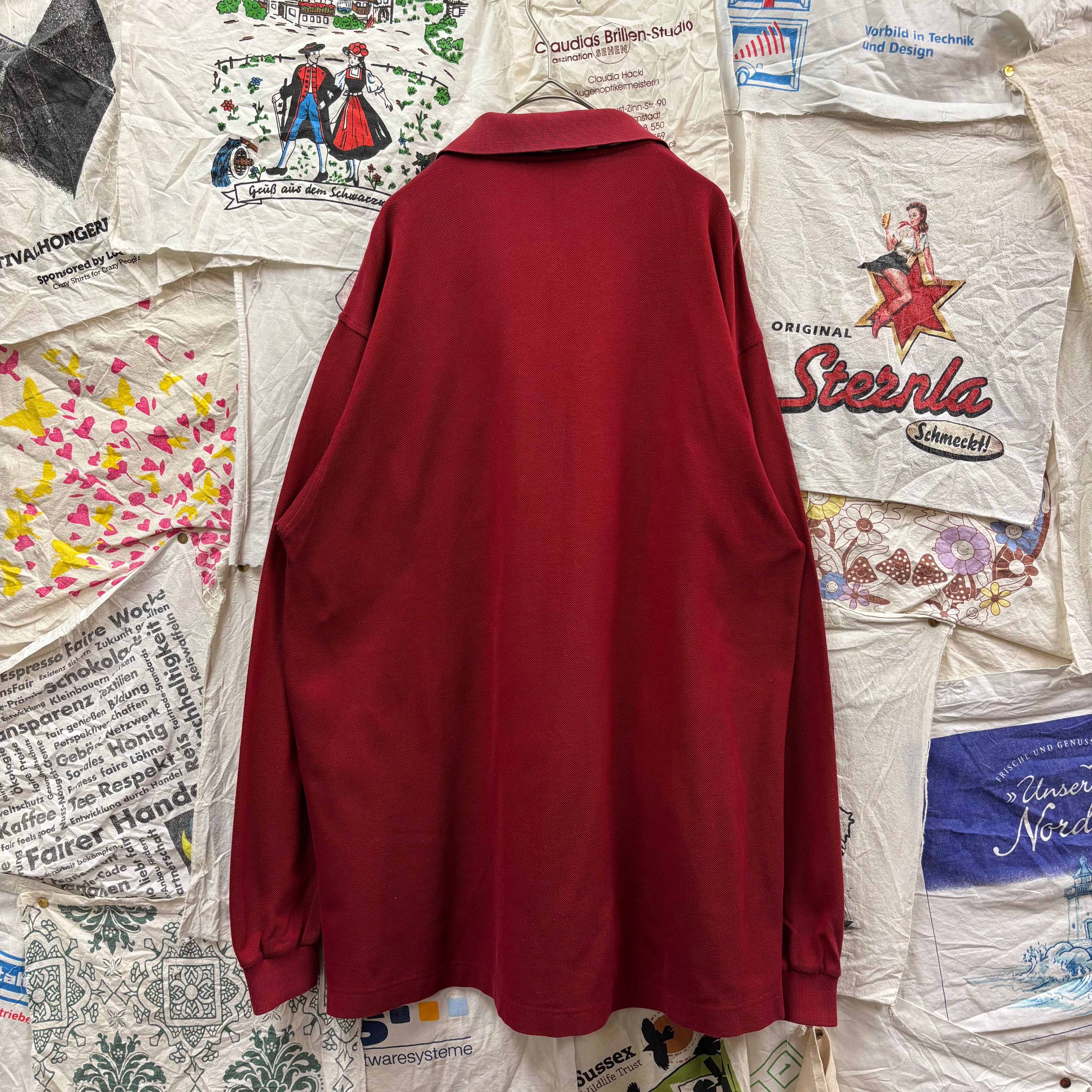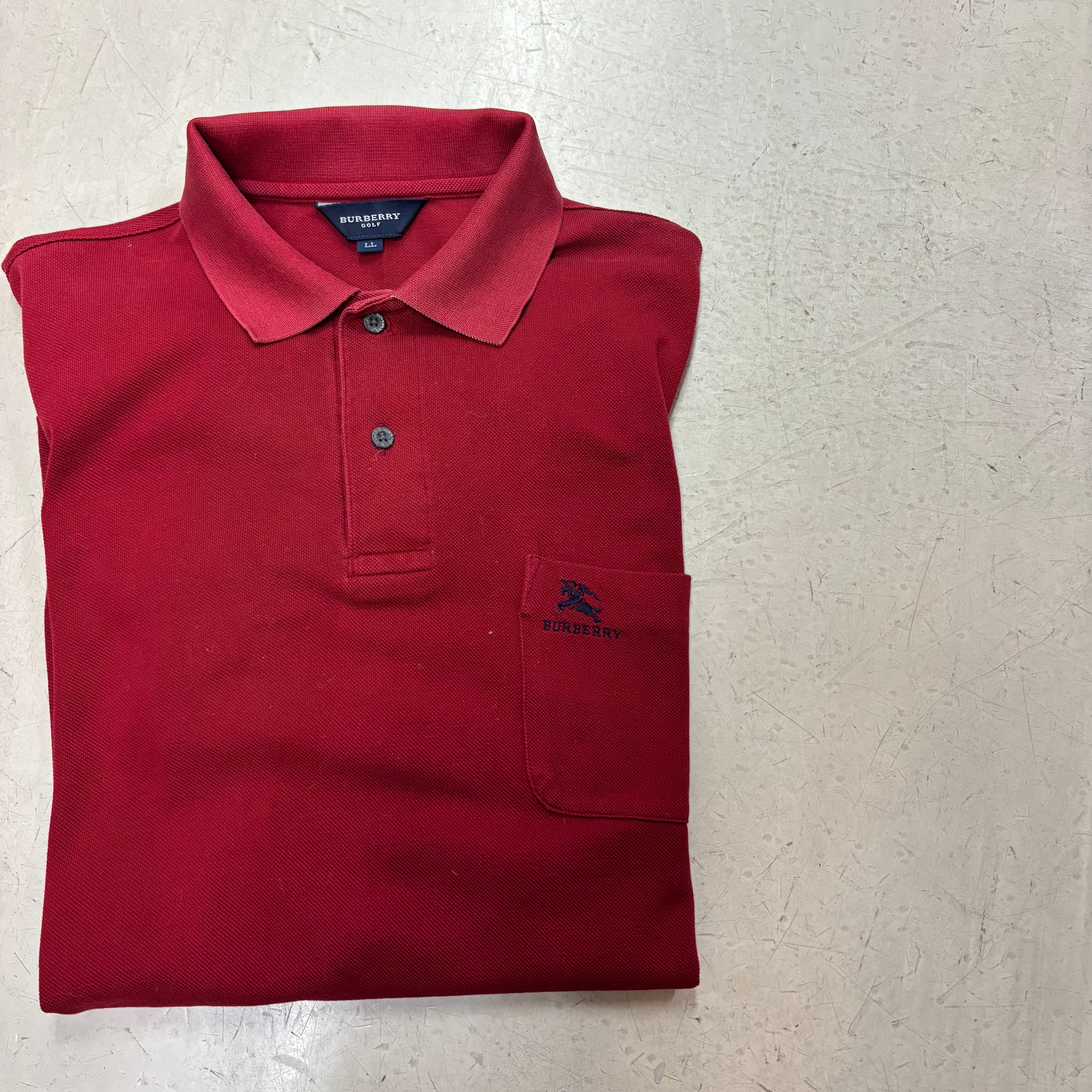 落ち着いた大人の色気を感じさせるボルドーカラー。胸ポケットに施された「ホースマーク」とブランドロゴの刺繍が、一目でバーバリーとわかる存在感を放ちます。LLサイズというゆったりとしたサイジングは、古着市場でも非常に人気が高く、リラックスしたシルエットで着用いただけます。