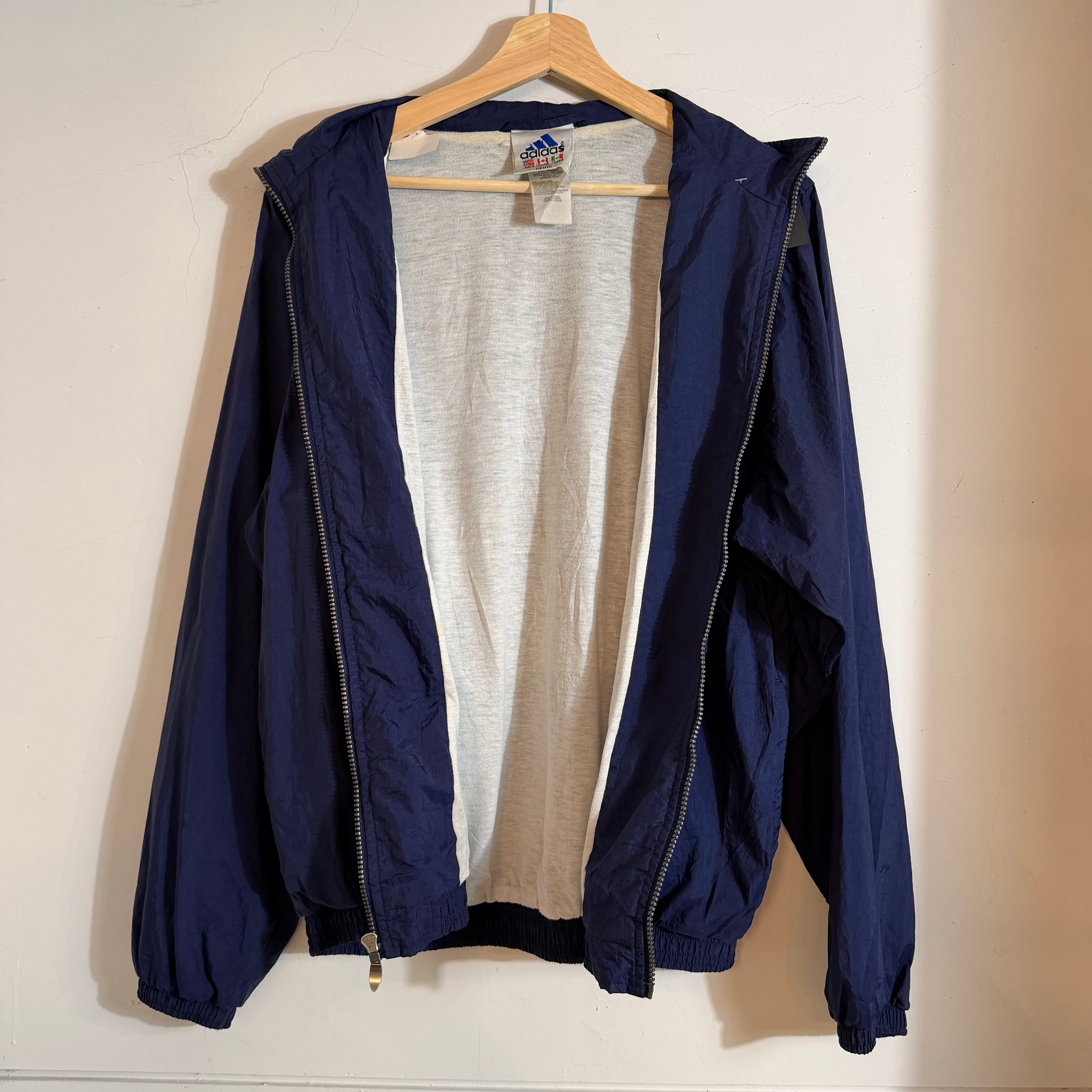90s adidasの万国旗タグが付くナイロンジャケット。ロゴ刺繍とラインデザインが映える、当時らしいスポーティーな一枚。軽く羽織れる使い勝手の良さで、ストリートにもハマるヴィンテージアイテム。