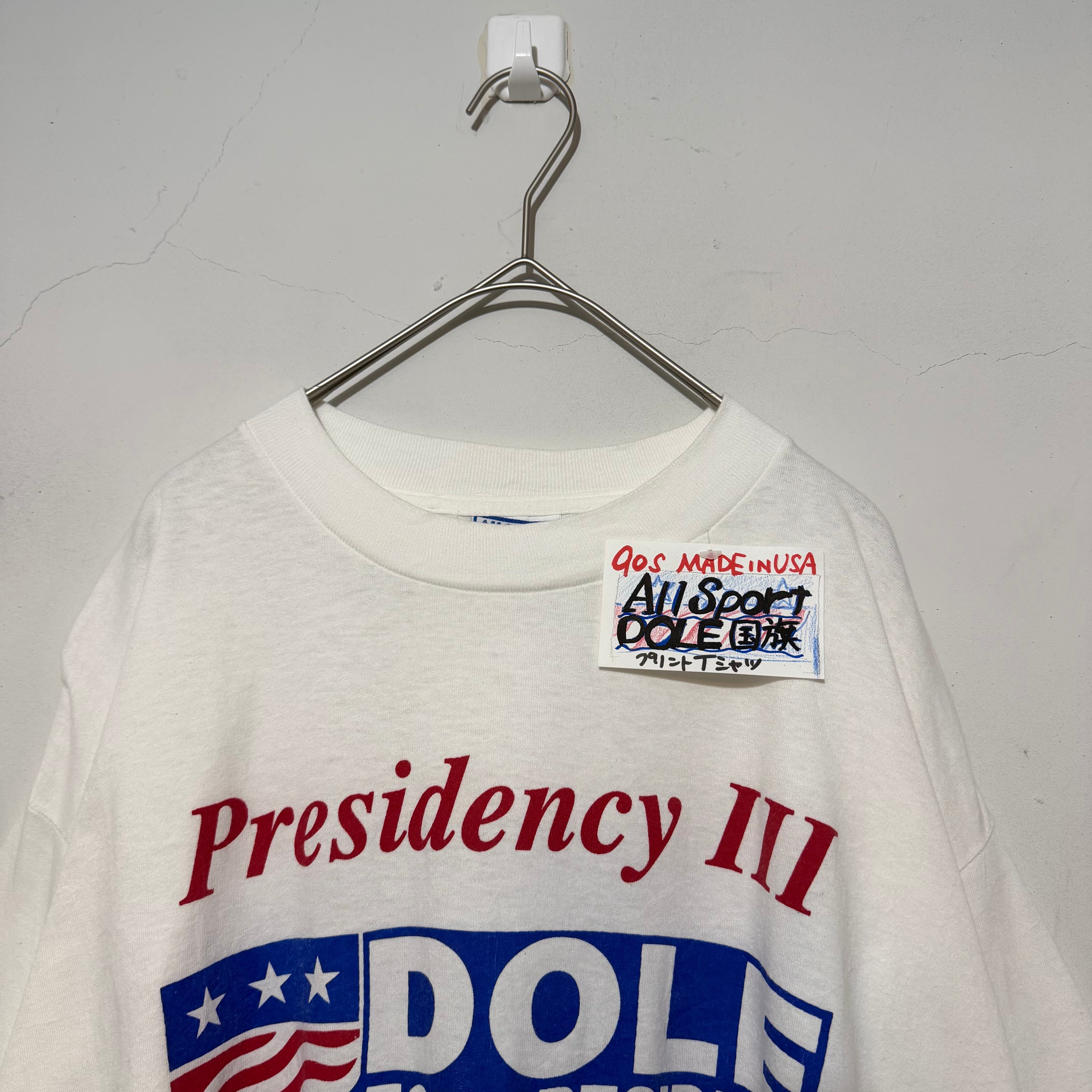 90年代USA製All SportボディのプリントTシャツ。DOLEロゴと国旗デザインが目を引く、アメリカンテイスト全開の一枚。シングルステッチならではの当時らしい雰囲気も魅力で、古着好きにはたまらないアイテム。